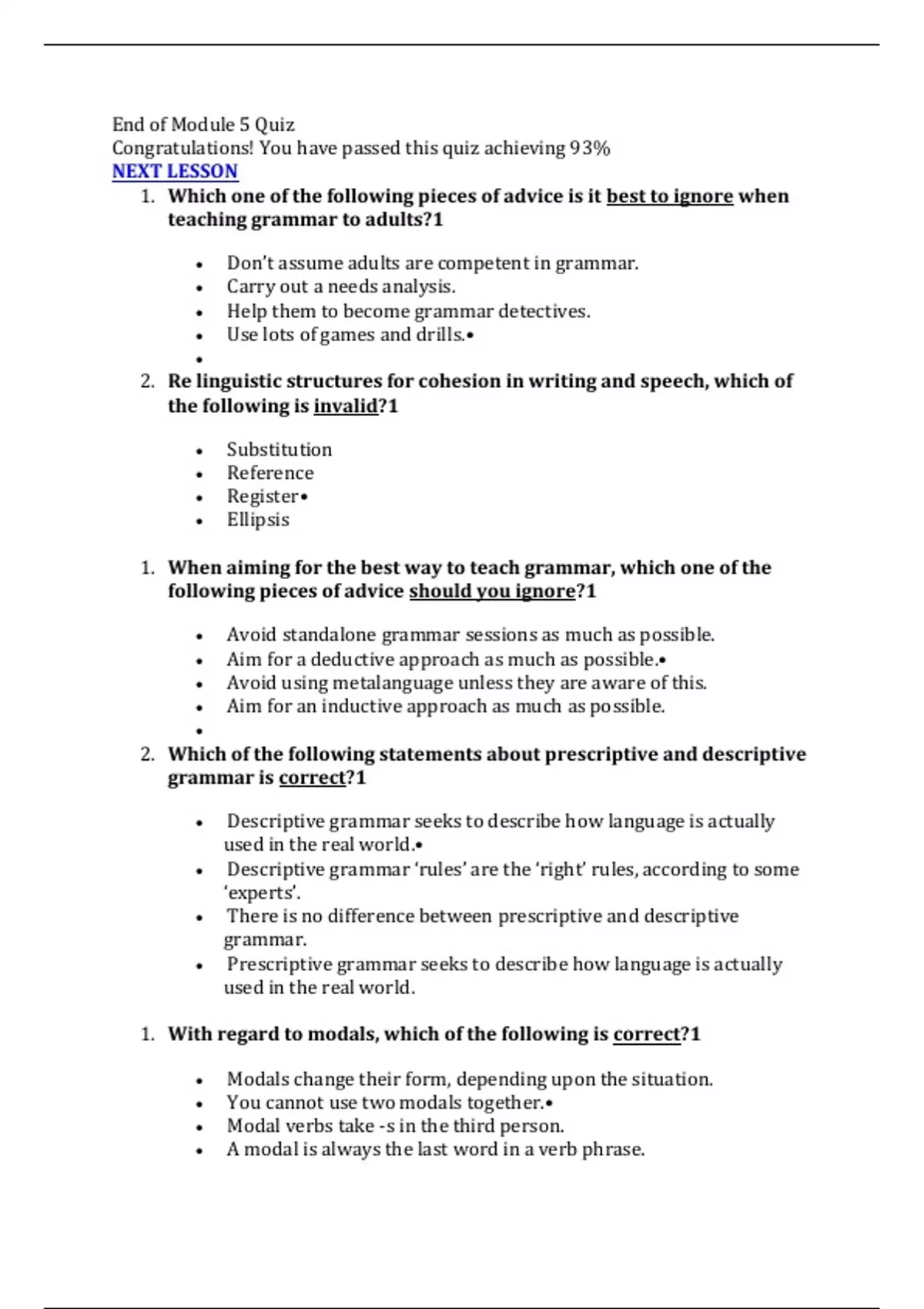TEFL Quiz 5 and answers pass guaranteed