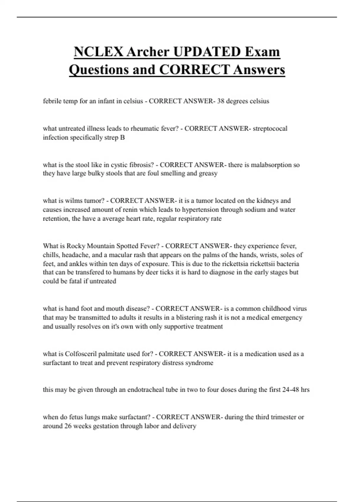 NCLEX Archer UPDATED Exam Questions and CORRECT Answers febrile temp for an infant in celsius - CORRECT ANSWER- 38 degrees celsius what untreated illness leads to rheumatic fever? - CORRECT ANSWER- streptococal infection specifically strep B what is the stool like in cystic fibrosis? - CORRECT ANSWER- there is malabsorption so they have large bulky stools that are foul smelling and greasy what is wilms tumor? - CORRECT ANSWER- it is a tumor located on the kidneys and causes increased amount of renin which leads to hypertension through sodium and water retention, the have a average heart rate, regular respiratory rate