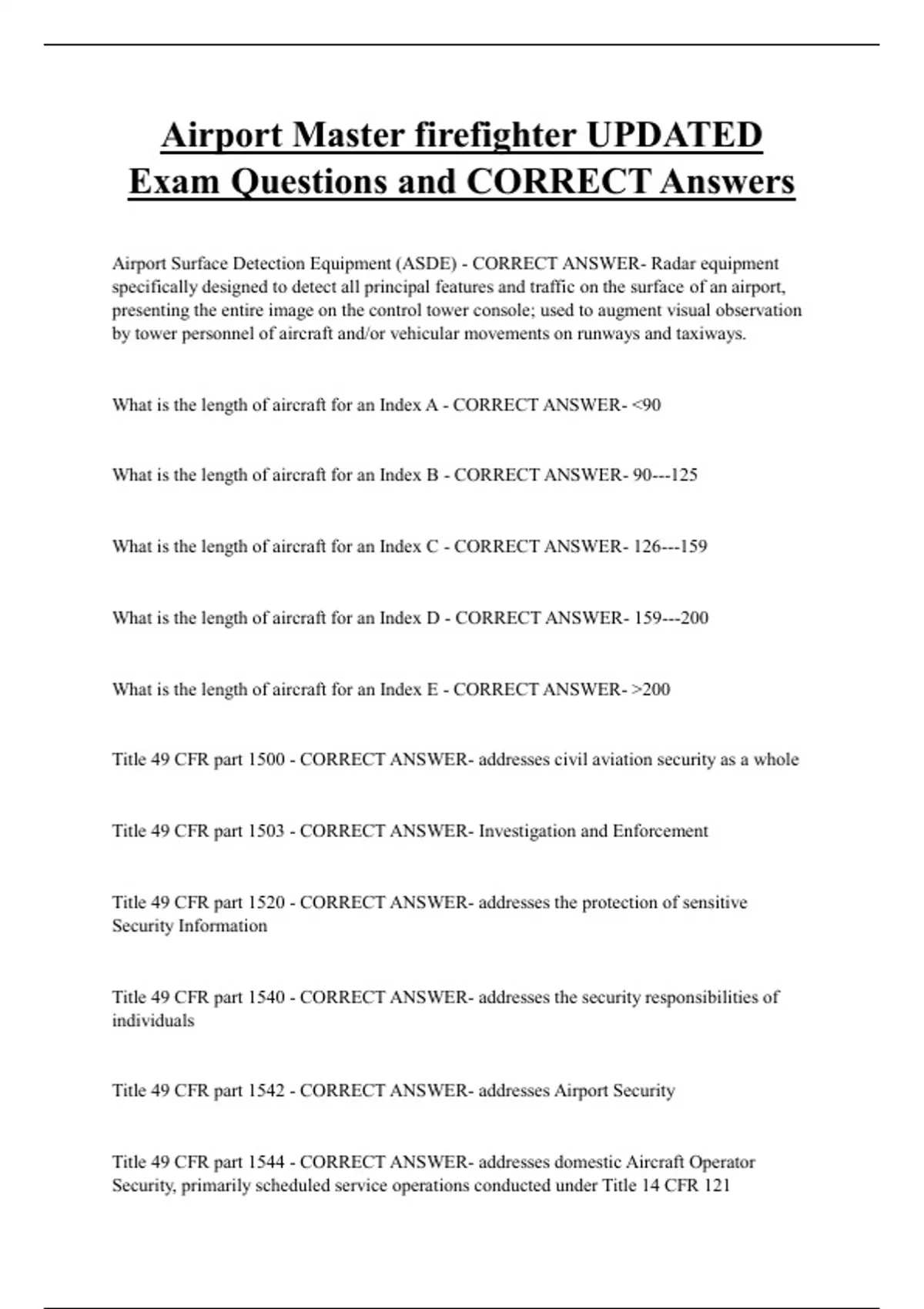 Airport Master firefighter UPDATED Exam Questions and CORRECT Answers Airport Surface Detection Equipment (ASDE) - CORRECT ANSWER- Radar equipment specifically designed to detect all principal features and traffic on the surface of an airport, presenting the entire image on the control tower console; used to augment visual observation by tower personnel of aircraft and/or vehicular movements on runways and taxiways. What is the length of aircraft for an Index A - CORRECT ANSWER- <90 What is the length of aircraft for an Index B - CORRECT ANSWER- 90---125 What is the length of aircraft for an Index C - CORRECT ANSWER- 126---159 What is the length of aircraft for an Index D - CORRECT ANSWER- 159---200