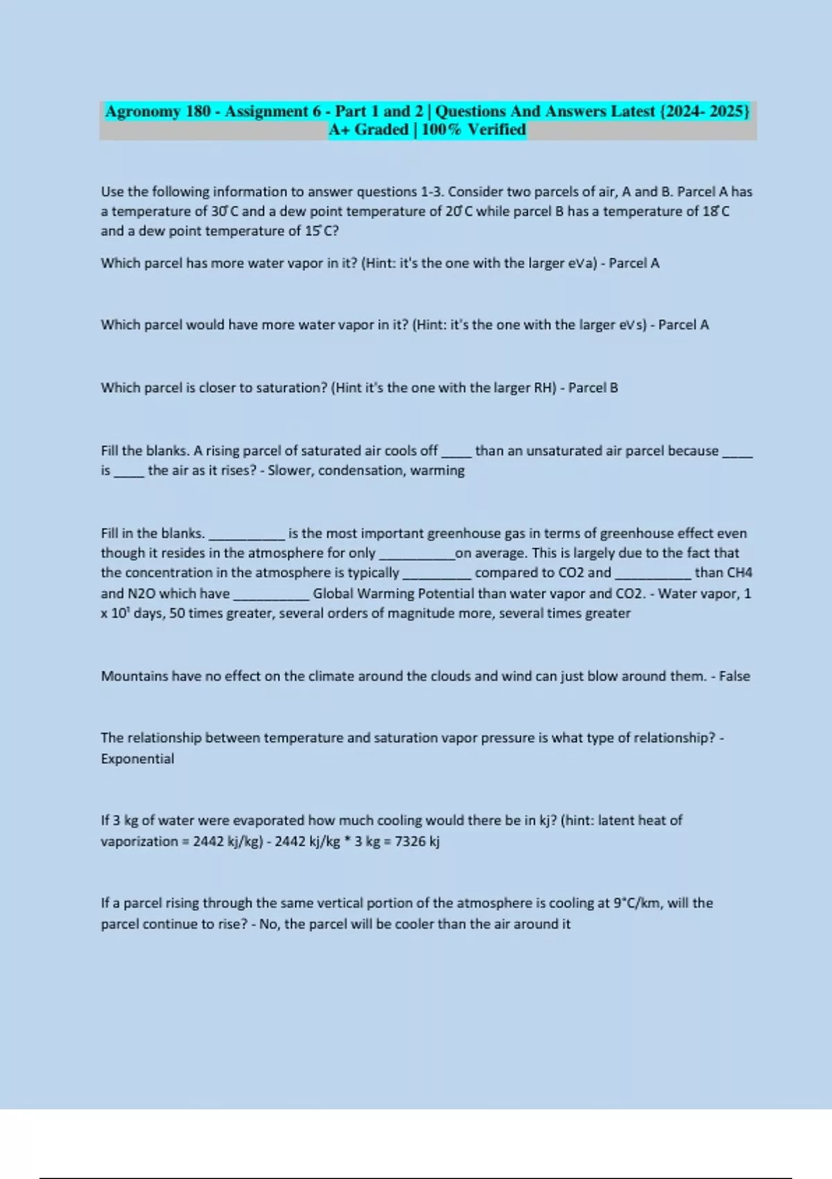 Agronomy 180 - Assignment 6 - Part 1 and 2 | Questions And Answers Latest {2024- 2025}