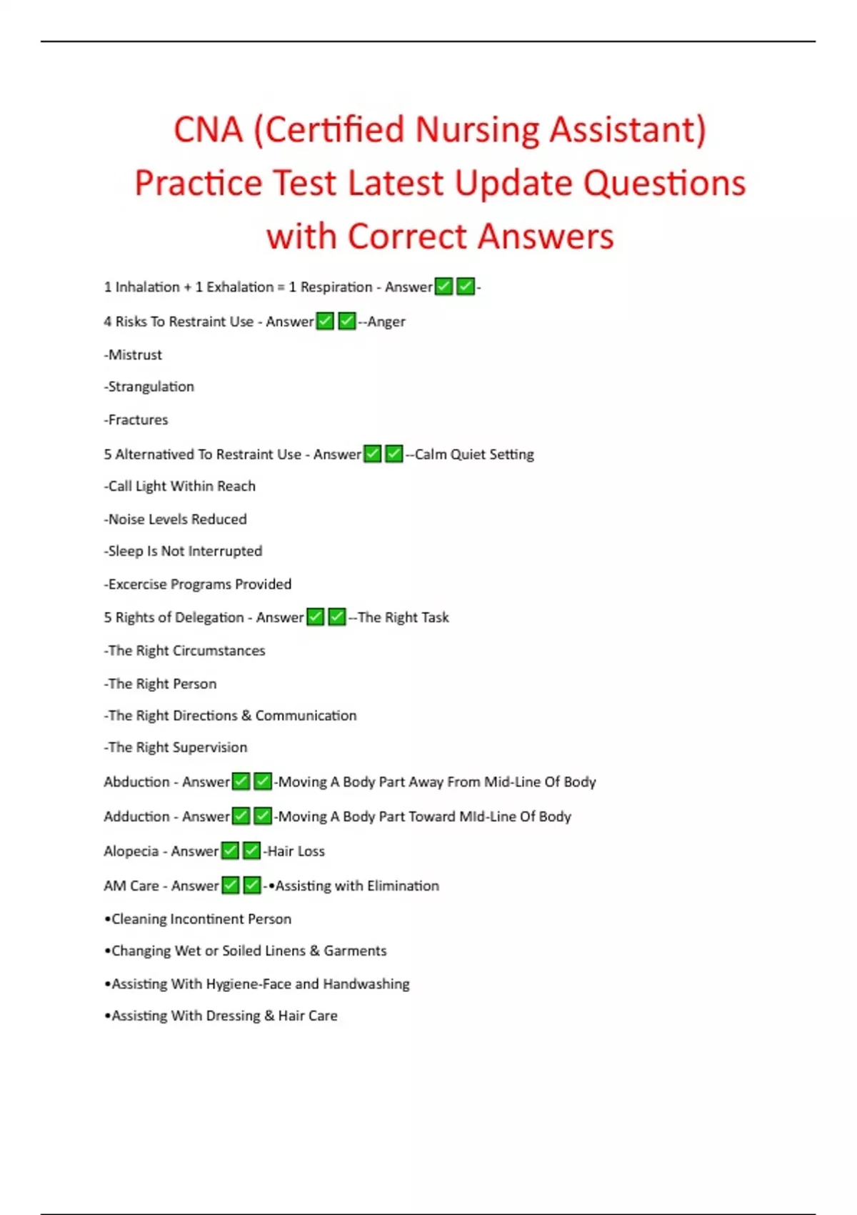 CNA (Certified Nursing Assistant) Practice Test Latest Update Questions with Correct Answers 1 Inhalation + 1 Exhalation = 1 Respiration - Answer - 4 Risks To Restraint Use - Answer --Anger -Mistrust -Strangulation -Fractures 5 Alternatived To Restraint Use - Answer --Calm Quiet Setting -Call Light Within Reach -Noise Levels Reduced -Sleep Is Not Interrupted -Excercise Programs Provided 5 Rights of Delegation - Answer --The Right Task -The Right Circumstances -The Right Person -The Right Directions & Communication -The Right Supervision Abduction - Answer -Moving A Body Part Away From Mid-Line Of Body Adduction - Answer -Moving A Body Part Toward MId-Line Of Body Alopecia - Answer -Hair Loss AM Care - Answer -•Assisting with Elimination