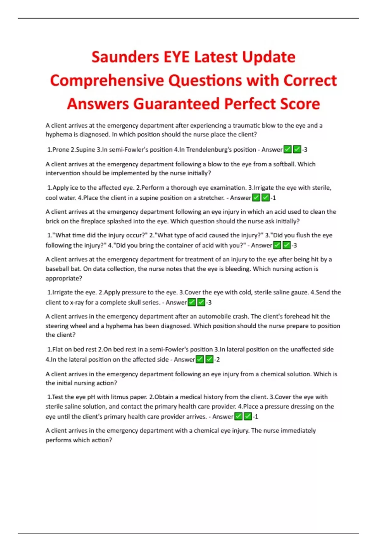 Saunders EYE Latest Update Comprehensive Questions with Correct Answers Guaranteed Perfect Score A client arrives at the emergency department after experiencing a traumatic blow to the eye and a hyphema is diagnosed. In which position should the nurse place the client? 1.Prone 2.Supine 3.In semi-Fowler's position 4.In Trendelenburg's position - Answer -3 A client arrives at the emergency department following a blow to the eye from a softball. Which intervention should be implemented by the nurse initially? 1.Apply ice to the affected eye. 2.Perform a thorough eye examination. 3.Irrigate the eye with sterile, cool water. 4.Place the client in a supine position on a stretcher. - Answer -1 A client arrives at the emergency department following an eye injury in which an acid used to clean the brick on the fireplace splashed into the eye. Which question should the nurse ask initially? 1."What time did the injury occur?" 2."What type of acid caused the injury?" 3."Did you flush the eye following the injury?" 4."Did you bring the container of acid with you?" - Answer -3 A client arrives at the emergency department for treatment of an injury to the eye after being hit by a baseball bat. On data collection, the nurse notes that the eye is bleeding. Which nursing action is appropriate? 1.Irrigate the eye. 2.Apply pressure to the eye. 3.Cover the eye with cold, sterile saline gauze. 4.Send the client to x-ray for a complete skull series. - Answer -3 A client arrives in the emergency department after an automobile crash. The client's forehead hit the steering wheel and a hyphema has been diagnosed. Which position should the nurse prepare to position the client? 1.Flat on bed rest 2.On bed rest in a semi-Fowler's position 3.In lateral position on the unaffected side 4.In the lateral position on the affected side - Answer -2 A client arrives in the emergency department following an eye injury from a chemical solution. Which is the initial nursing action? 1.Test the eye pH with litmus paper. 2.Obtain a medical history from the client. 3.Cover the eye with sterile saline solution, and contact the primary health care provider. 4.Place a pressure dressing on the eye until the client's primary health care provider arrives. - Answer -1