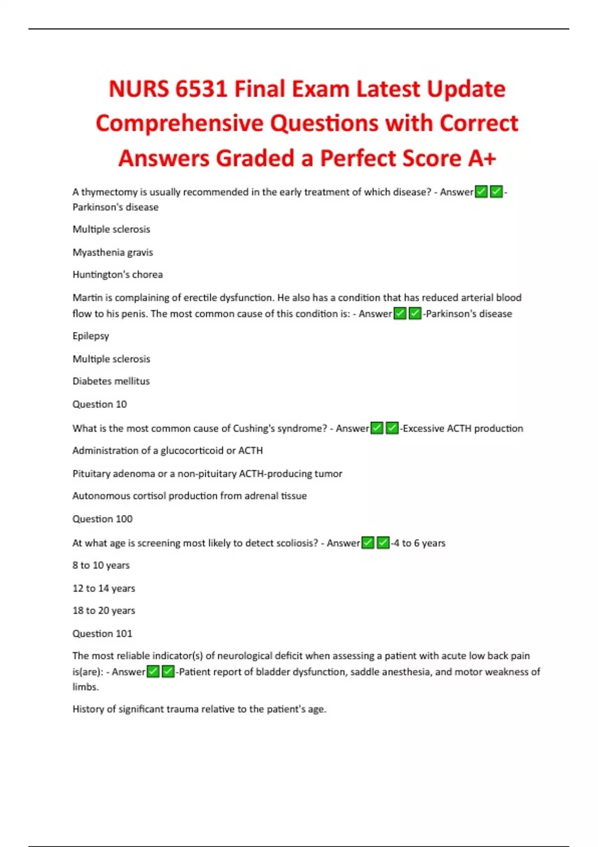 NURS 6531 Final Exam Latest Update Comprehensive Questions with Correct Answers Graded a Perfect Score A+ A thymectomy is usually recommended in the early treatment of which disease? - Answer - Parkinson's disease Multiple sclerosis Myasthenia gravis Huntington's chorea Martin is complaining of erectile dysfunction. He also has a condition that has reduced arterial blood flow to his penis. The most common cause of this condition is: - Answer -Parkinson's disease Epilepsy Multiple sclerosis Diabetes mellitus Question 10 What is the most common cause of Cushing's syndrome? - Answer -Excessive ACTH production Administration of a glucocorticoid or ACTH Pituitary adenoma or a non-pituitary ACTH-producing tumor Autonomous cortisol production from adrenal tissue Question 100 At what age is screening most likely to detect scoliosis? - Answer -4 to 6 years 8 to 10 years 12 to 14 years 18 to 20 years Question 101