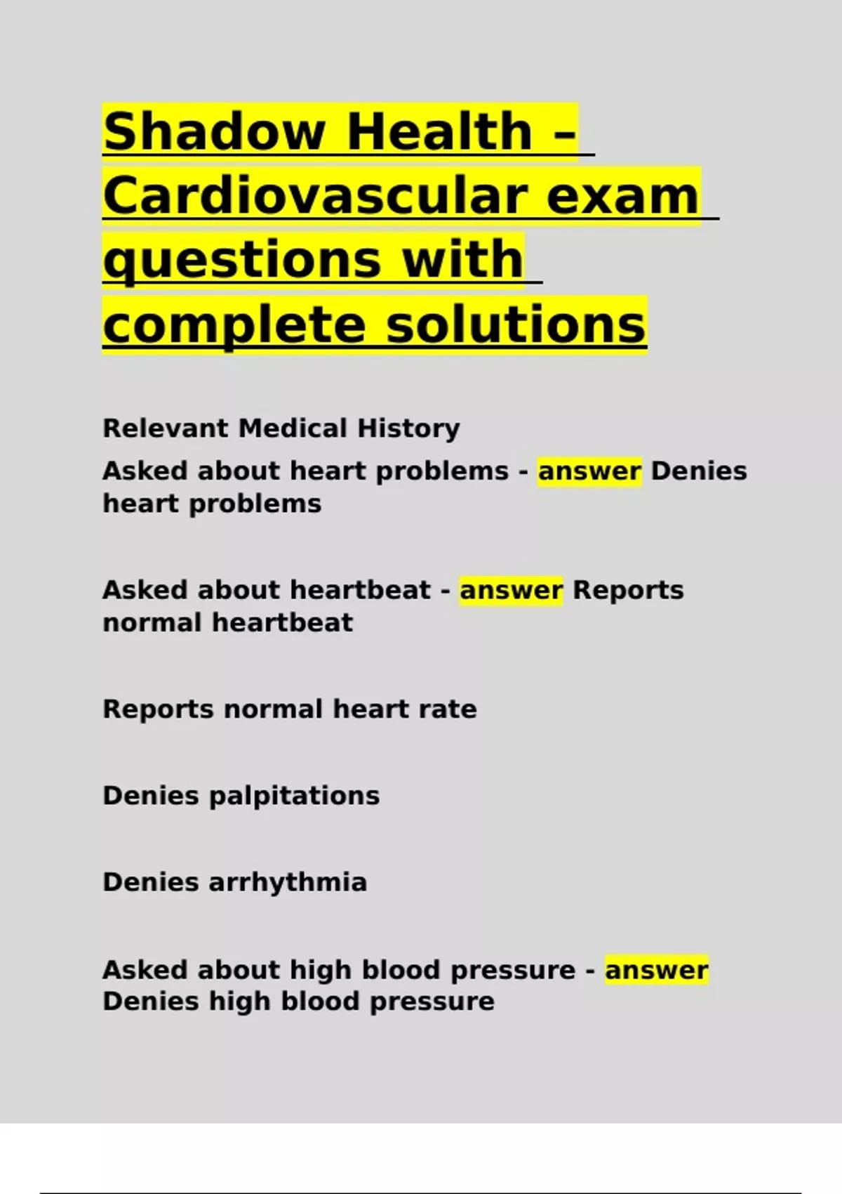 Shadow Health – Cardiovascular exam questions with complete solutions.