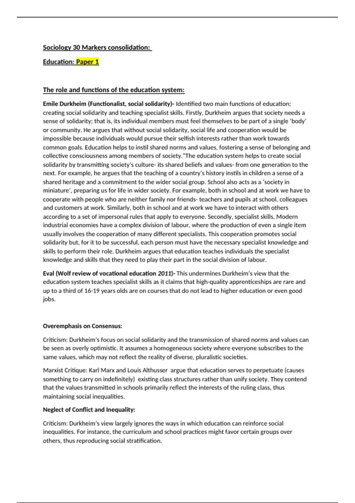 Summary Sociology AQA A Level Paper 1 - Education