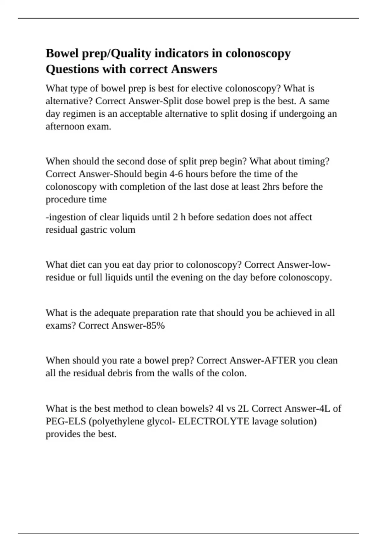 What type of bowel prep is best for elective colonoscopy? What is alternative? Correct Answer-Split dose bowel prep is the best. A same day regimen is an acceptable alternative to split dosing if undergoing an afternoon exam. When should the second dose of split prep begin? What about timing? Correct Answer-Should begin 4-6 hours before the time of the colonoscopy with completion of the last dose at least 2hrs before the procedure time -ingestion of clear liquids until 2 h before sedation does not affect residual gastric volum What diet can you eat day prior to colonoscopy? Correct Answer-low-residue or full liquids until the evening on the day before colonoscopy. What is the adequate preparation rate that should you be achieved in all exams? Correct Answer-85% When should you rate a bowel prep? Correct Answer-AFTER you clean all the residual debris from the walls of the colon. What is the best method to clean bowels? 4l vs 2L Correct Answer-4L of PEG-ELS (polyethylene glycol- ELECTROLYTE lavage solution) provides the best. -In healthy non-constipated inviduals, 4L is not necessarily better than 2L
