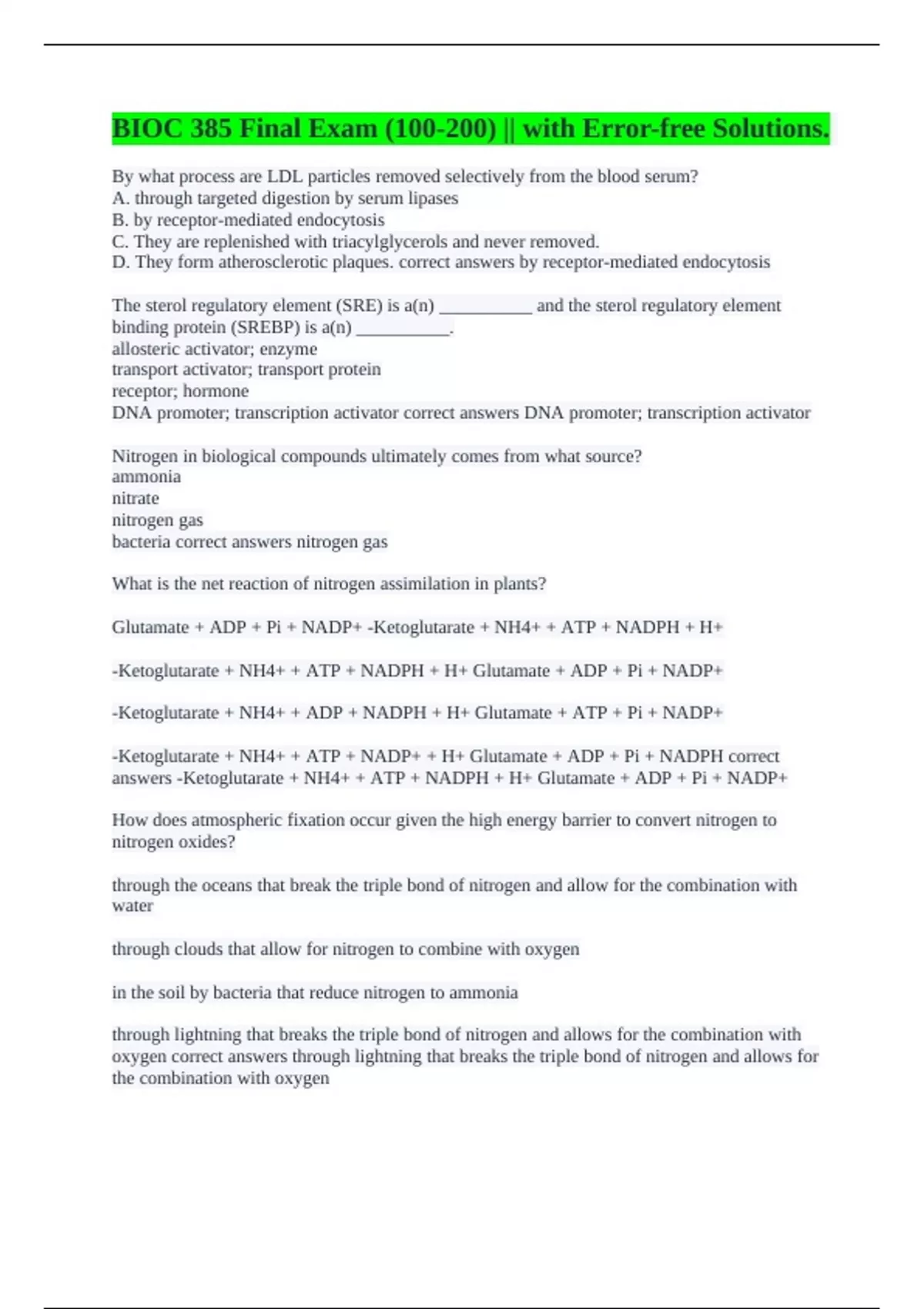 By what process are LDL particles removed selectively from the blood serum? A. through targeted digestion by serum lipases B. by receptor-mediated endocytosis C. They are replenished with triacylglycerols and never removed. D. They form atherosclerotic plaques. correct answers by receptor-mediated endocytosis The sterol regulatory element (SRE) is a(n) __________ and the sterol regulatory element binding protein (SREBP) is a(n) __________. allosteric activator; enzyme transport activator; transport protein receptor; hormone DNA promoter; transcription activator correct answers DNA promoter; transcription activator Nitrogen in biological compounds ultimately comes from what source? ammonia nitrate nitrogen gas bacteria correct answers nitrogen gas What is the net reaction of nitrogen assimilation in plants? Glutamate + ADP + Pi + NADP+ -Ketoglutarate + NH4+ + ATP + NADPH + H+ -Ketoglutarate + NH4+ + ATP + NADPH + H+ Glutamate + ADP + Pi + NADP+ -Ketoglutarate + NH4+ + ADP + NADPH + H+ Glutamate + ATP + Pi + NADP+ -Ketoglutarate + NH4+ + ATP + NADP+ + H+ Glutamate + ADP + Pi + NADPH correct answers -Ketoglutarate + NH4+ + ATP + NADPH + H+ Glutamate + ADP + Pi + NADP+ How does atmospheric fixation occur given the high energy barrier to convert nitrogen to nitrogen oxides? through the oceans that break the triple bond of nitrogen and allow for the combination with water through clouds that allow for nitrogen to combine with oxygen in the soil by bacteria that reduce nitrogen to ammonia through lightning that breaks the triple bond of nitrogen and allows for the combination with oxygen correct answers through lightning that breaks the triple bond of nitrogen and allows for the combination with oxygen