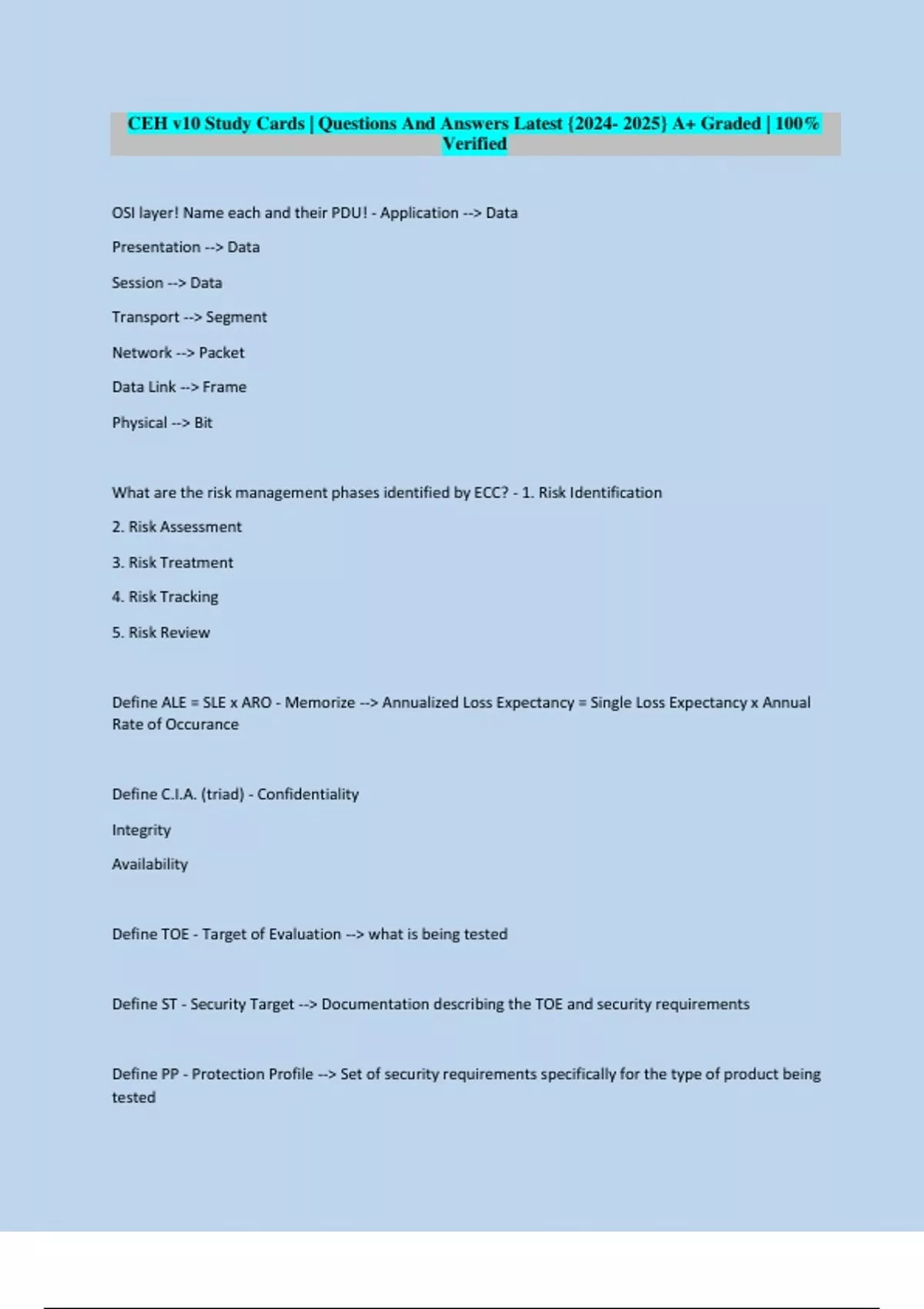 Define ALE = SLE x ARO - Memorize --> Annualized Loss Expectancy = Single Loss Expectancy x Annual