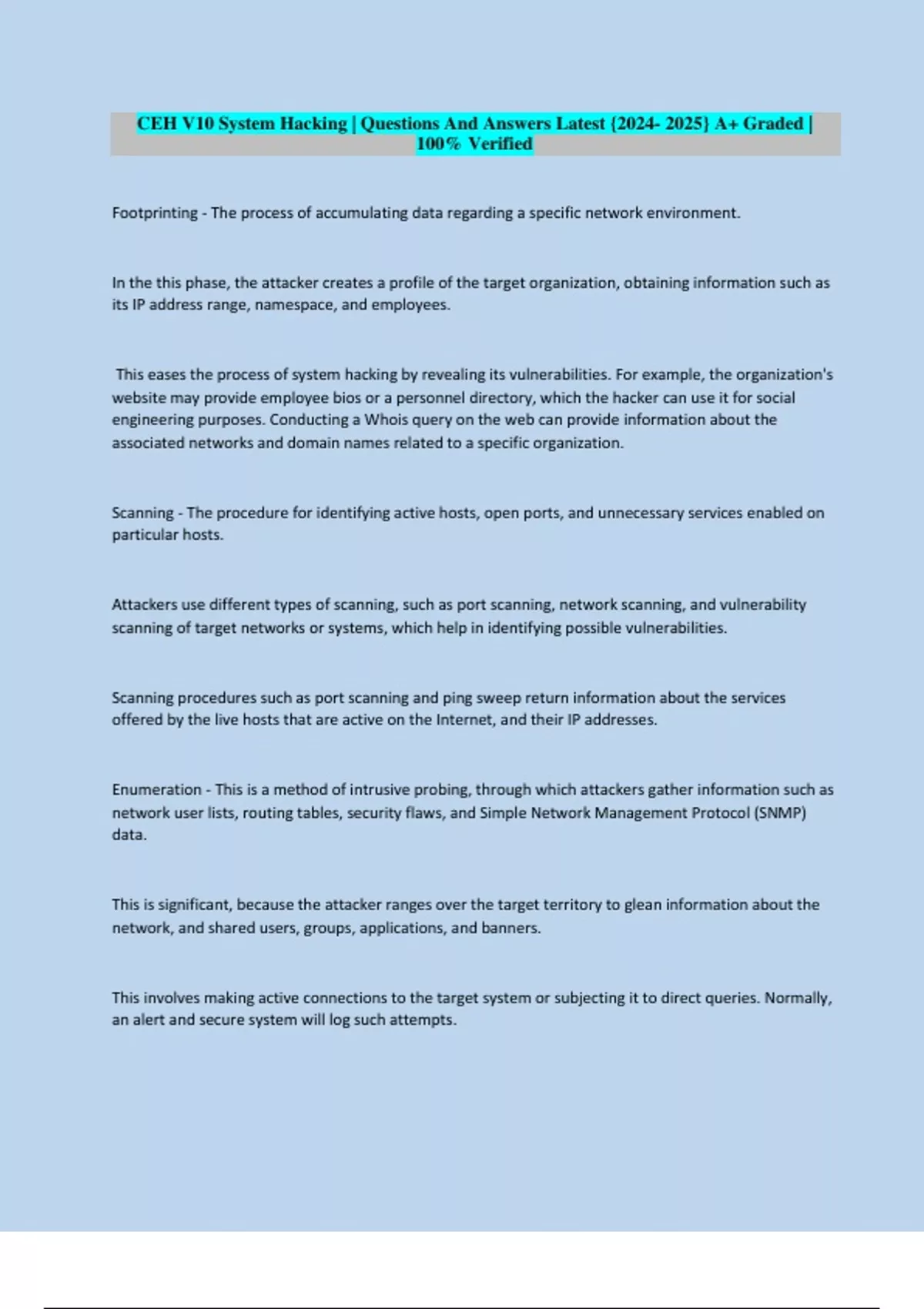 Attackers use different types of scanning, such as port scanning, network scanning, and vulnerability