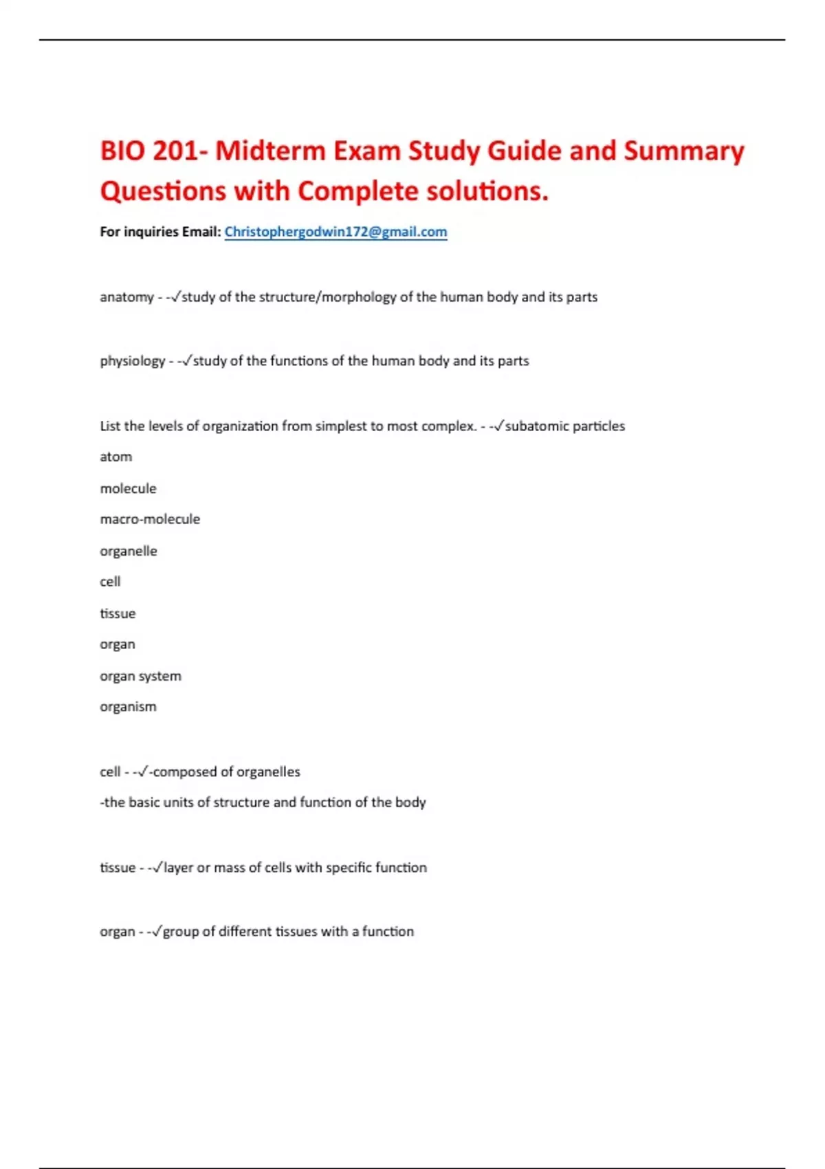 BIO 201- Midterm Exam Study Guide and Summary Questions with Complete solutions.