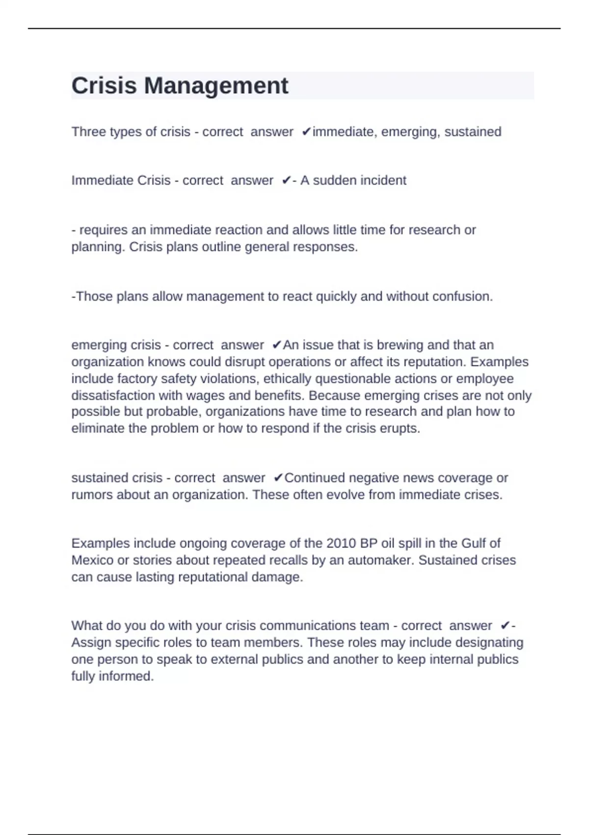 Three types of crisis - correct answer ✔immediate, emerging, sustained