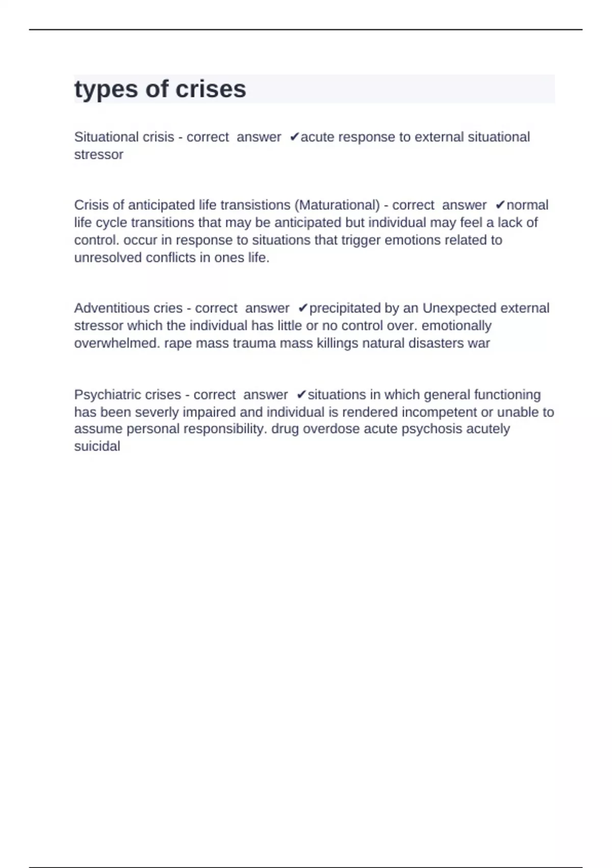 Situational crisis - correct answer ✔acute response to external situational
