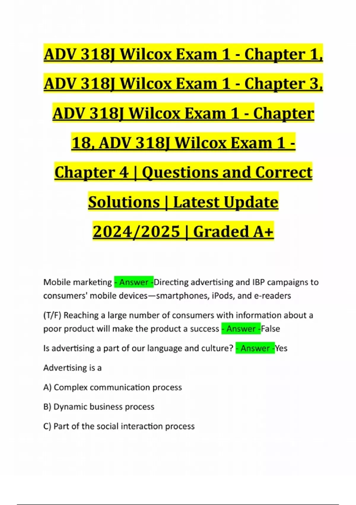ADV 318J Wilcox Exam 1 - Chapter 1, ADV 318J Wilcox Exam 1 - Chapter 3, ADV 318J Wilcox Exam 1 - Chapter 18, ADV 318J Wilcox Exam 1 - Chapter 4 | Questions and Correct Solutions | Latest Update 2024/2025 | Graded A+ Mobile marketing - Answer -Directing advertising and IBP campaigns to consumers' mobile devices—smartphones, iPods, and e-readers (T/F) Reaching a large number of consumers with information about a poor product will make the product a success - Answer -False Is advertising a part of our language and culture? - Answer -Yes Advertising is a A) Complex communication process B) Dynamic business process C) Part of the social interaction processD) All of the above - Answer -D) All of the above What is a paid, mass-mediated attempt to persuade? - Answer - Advertising Client - Answer -The company or organization that pays for advertising. Also called the sponsor (T/F) If a communication is not paid for, it's not advertising - Answer - True Are public service announcements considered advertising? - Answer - No