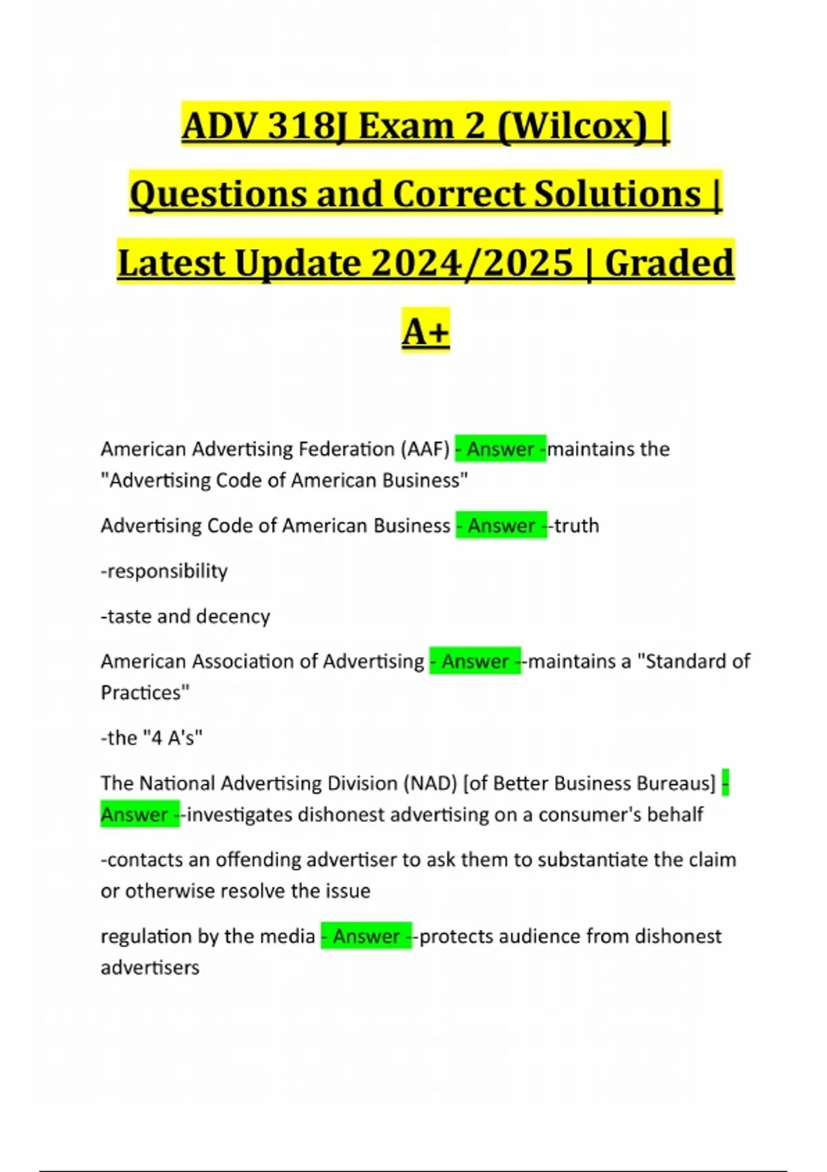 ADV 318J Exam 2 (Wilcox) | Questions and Correct Solutions | Latest Update 2024/2025 | Graded A+ American Advertising Federation (AAF) - Answer -maintains the "Advertising Code of American Business" Advertising Code of American Business - Answer --truth -responsibility -taste and decency American Association of Advertising - Answer --maintains a "Standard of Practices" -the "4 A's" The National Advertising Division (NAD) [of Better Business Bureaus] - Answer --investigates dishonest advertising on a consumer's behalf -contacts an offending advertiser to ask them to substantiate the claim or otherwise resolve the issue regulation by the media - Answer --protects audience from dishonest advertisers-protects audience's values examples of advocacy/pressure groups - Answer -examples: -Center for Alcohol Marketing and Youth -Center for Science in the Public Interest -Parents Television Council