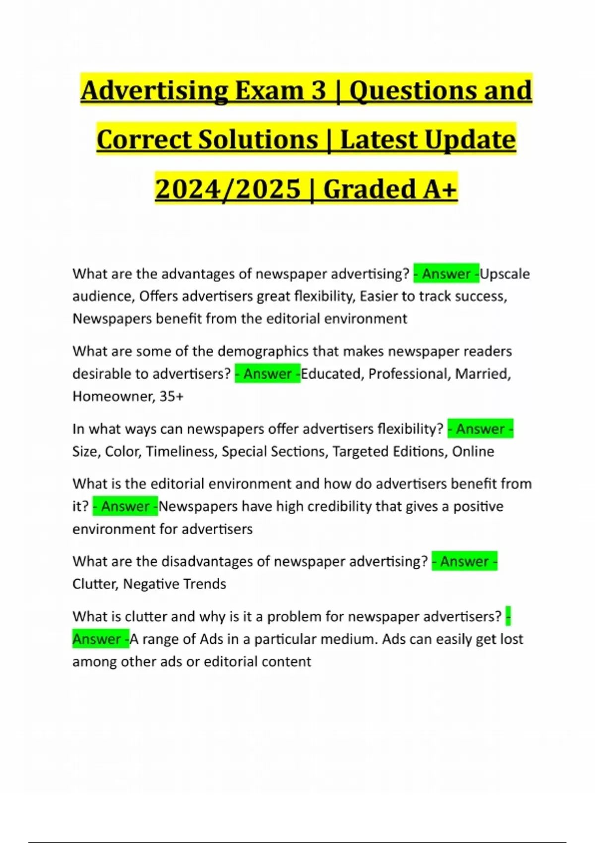 Advertising Exam 3 | Questions and Correct Solutions | Latest Update 2024/2025 | Graded A+ What are the advantages of newspaper advertising? - Answer -Upscale audience, Offers advertisers great flexibility, Easier to track success, Newspapers benefit from the editorial environment What are some of the demographics that makes newspaper readers desirable to advertisers? - Answer -Educated, Professional, Married, Homeowner, 35+ In what ways can newspapers offer advertisers flexibility? - Answer - Size, Color, Timeliness, Special Sections, Targeted Editions, Online What is the editorial environment and how do advertisers benefit from it? - Answer -Newspapers have high credibility that gives a positive environment for advertisers What are the disadvantages of newspaper advertising? - Answer - Clutter, Negative Trends What is clutter and why is it a problem for newspaper advertisers? - Answer -A range of Ads in a particular medium. Ads can easily get lost among other ads or editorial contentList four categories of newspaper ads - Answer -Classified, Local, National, Online Classified Ads - Answer -Published in sections set aside for certain classes of goods or services Local Ads - Answer -Generally ads for local businesses, also includes national retailers National Ads - Answer -Generally a