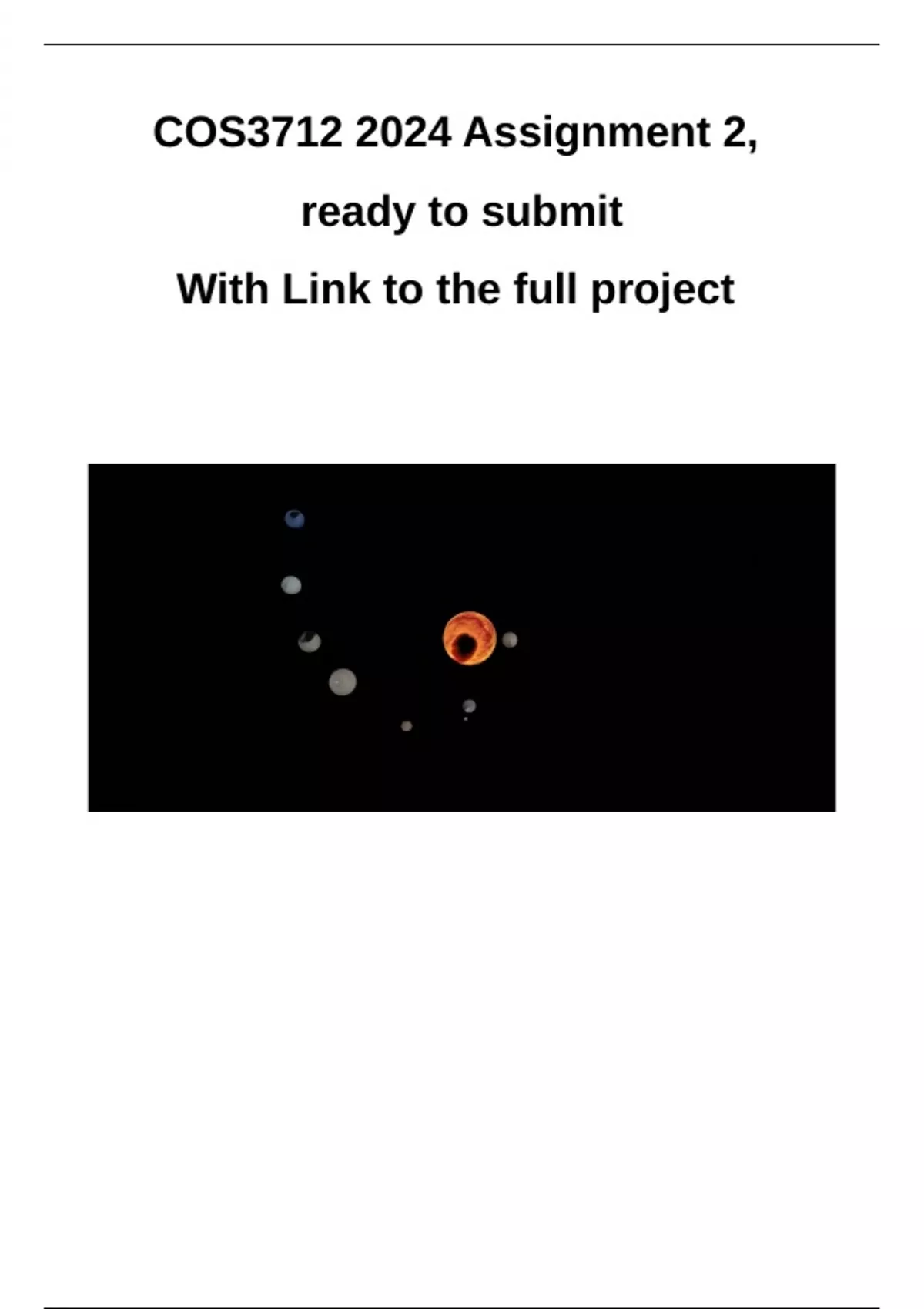 COS3712 Assignment 2 full project 2024 ready to submit COS3712 Assessment 1 and Assessment 2 Assessment 1 and 2 is one project, that is submitted in two parts. 3D Solar System Simulation Objective: Develop a simplified 3D simulation of the solar system, showcasing the sun, planets, and their moons. The simulation will include basic animations to represent planetary rotations and orbits around the sun. Assessment 1 Key Features to Implement: 3D Models for Planets and Moons: Create or import simple 3D models representing the sun, planets, and significant moons. Spheres with different sizes and textures can effectively represent these celestial bodies. Animations: Implement rotational animations for planets and moons to simulate their spin on their axis. Create orbital animations to simulate the movement of planets around the sun and moons around their respective planets. Camera Controls: Implement basic camera controls to allow users to navigate through the solar system, zoom in/out, and focus on different planets. Deliverables: Source code for the 3D solar system simulation. A simple user interface to control the simulation, such as adjusting the speed of rotations and orbits or selecting a planet to focus on. Documentation that describes the implemented features and how to interact with the simulation. Tools and Technologies: Programming Language: Preferably C++, Python or Javascript with a graphics library like OpenGL, WebGL and T or a game engine like Unity or Unreal Engine that simplifies 3D graphics programming. You can choose how to do the project.Textures: Public domain images from NASA or other space agencies for planet textures. Learning Outcomes: • • • • Gain an understanding of basic 3D modeling and texturing. Learn how to implement simple animations in 3D space. Understand the basics of lighting in a 3D scene. Develop skills in using a 3D graphics API or game engine. Assessment 2 Add the following to your Solar System Simulation Texturing: • • Apply textures to the spheres to visually differentiate between the celestial bodies (e.g., Earth, Mars, Jupiter). Use images of planet surfaces for textures to increase realism. Lighting: •Simulate sunlight using a directional light source. •Ensure that the sun illuminates the planets and moons, creating realistic day/night cycles.