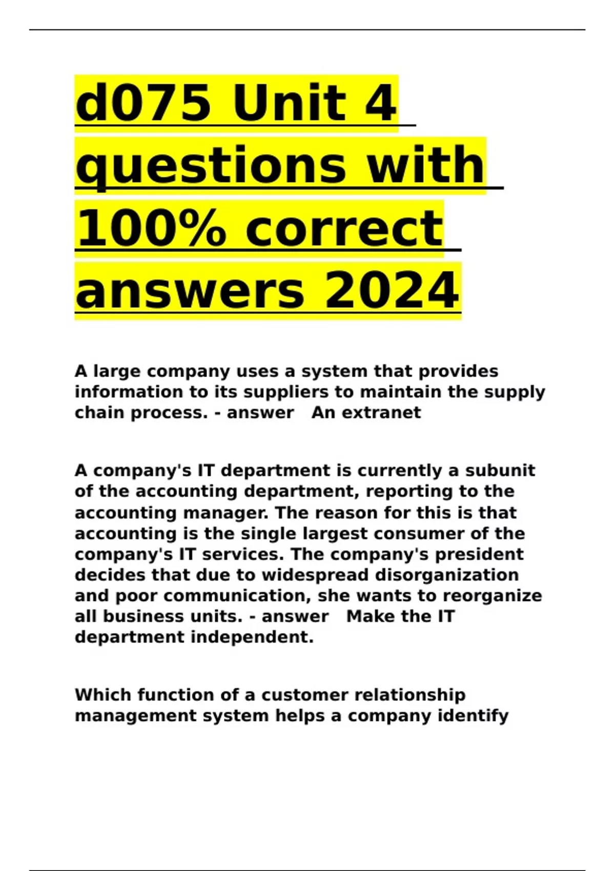 d075 Unit 4 questions with 100- correct answers 2024.