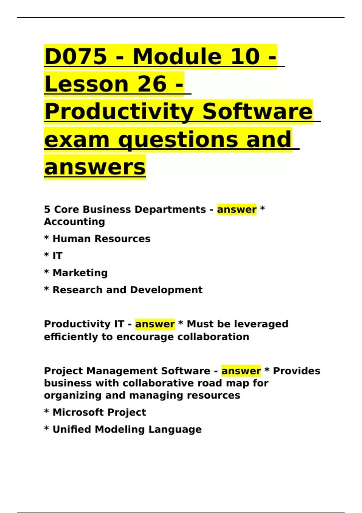 D075 - Module 10 - Lesson 26 - Productivity Software exam questions and answers.