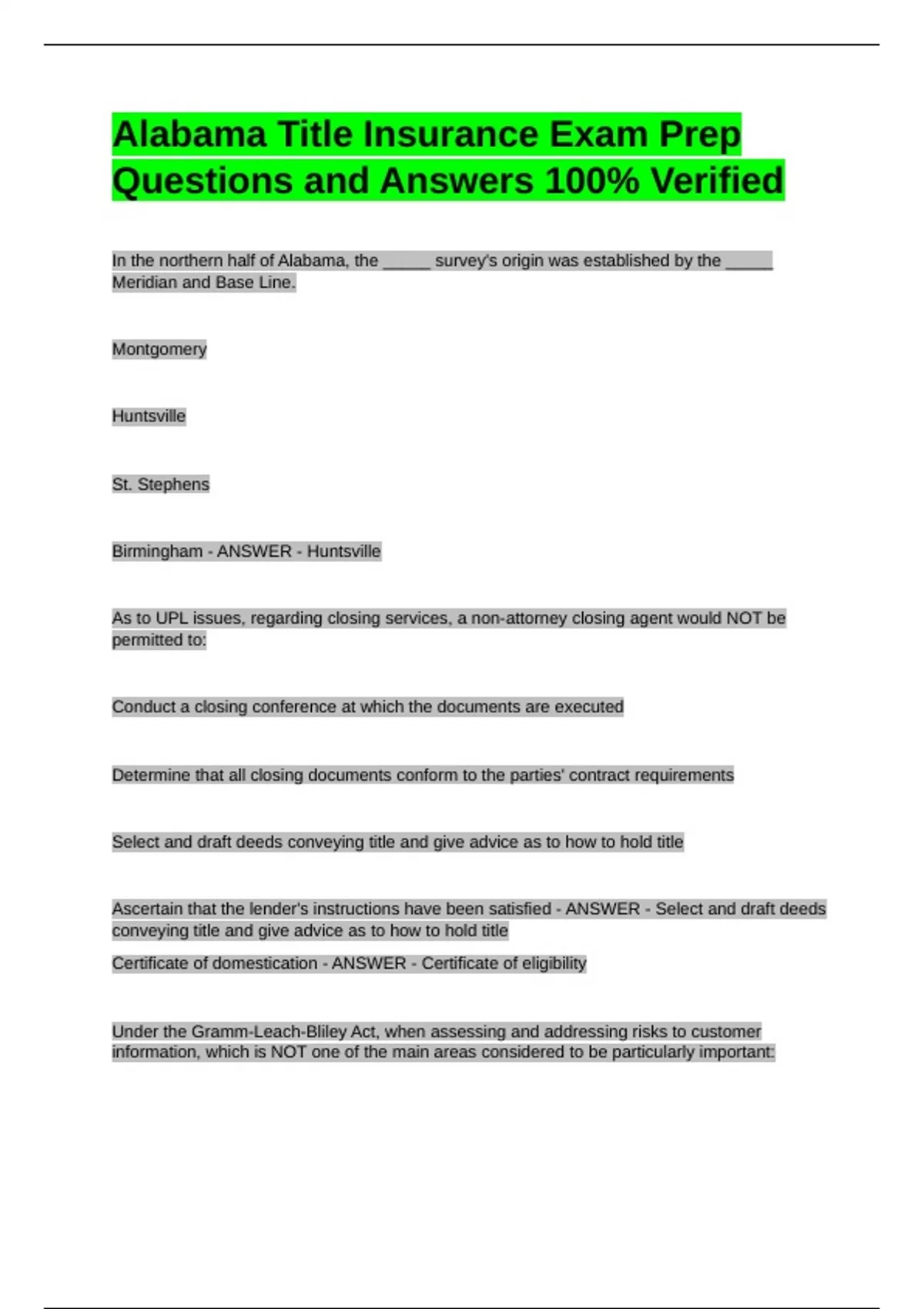 Alabama Title Insurance Exam Prep Questions and Answers 100% VerifiedAlabama Title Insurance Exam Prep Questions and Answers 100% VerifiedAlabama Title Insurance Exam Prep Questions and Answers 100% VerifiedAlabama Title Insurance Exam Prep Questions and Answers 100% Verified In the northern half of Alabama, the _____ survey's origin was established by the _____ Meridian and Base Line. Montgomery Huntsville St. Stephens Birmingham - ANSWER - Huntsville As to UPL issues, regarding closing services, a non-attorney closing agent would NOT be permitted to: