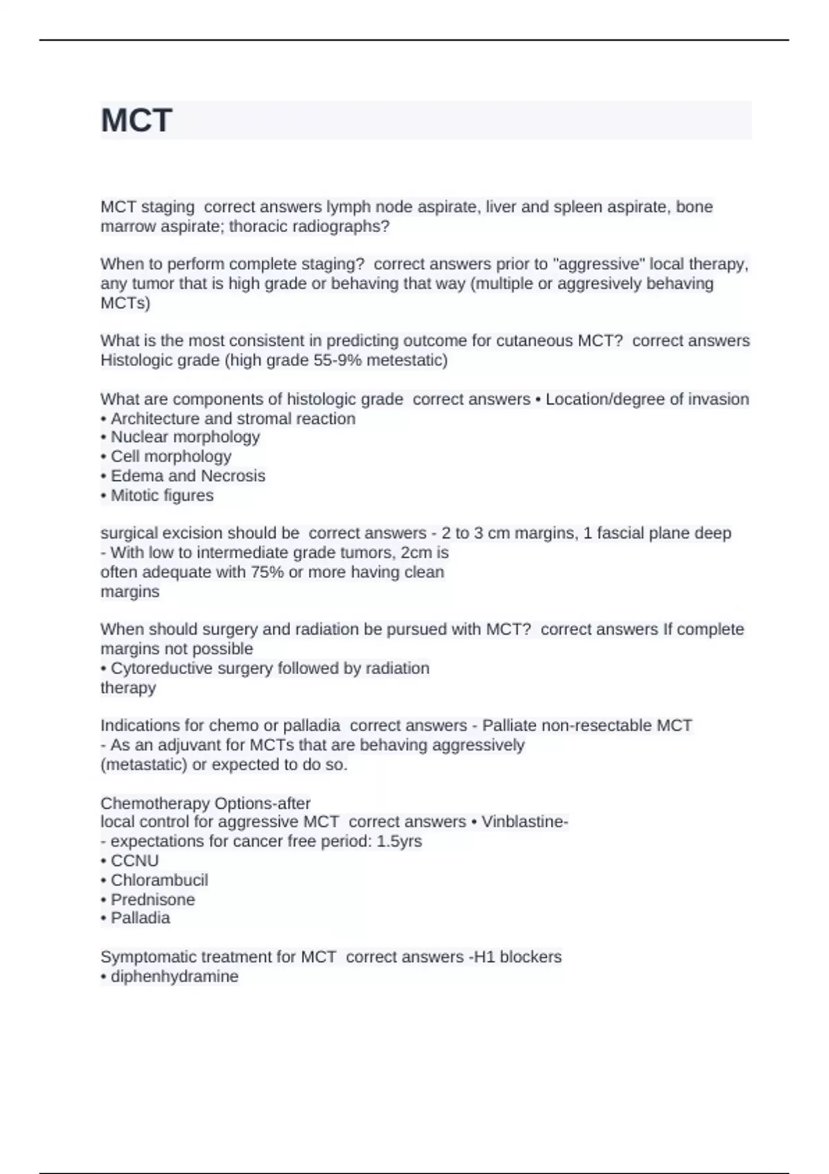 MCT staging correct answers lymph node aspirate, liver and spleen aspirate, bone marrow aspirate; thoracic radiographs? When to perform complete staging? correct answers prior to "aggressive" local therapy, any tumor that is high grade or behaving that way (multiple or aggresively behaving MCTs) What is the most consistent in predicting outcome for cutaneous MCT? correct answers Histologic grade (high grade 55-9% metestatic) What are components of histologic grade correct answers • Location/degree of invasion • Architecture and stromal reaction • Nuclear morphology • Cell morphology • Edema and Necrosis • Mitotic figures surgical excision should be correct answers - 2 to 3 cm margins, 1 fascial plane deep - With low to intermediate grade tumors, 2cm is often adequate with 75% or more having clean margins When should surgery and radiation be pursued with MCT? correct answers If complete margins not possible • Cytoreductive surgery followed by radiation therapy Indications for chemo or palladia correct answers - Palliate non-resectable MCT - As an adjuvant for MCTs that are behaving aggressively (metastatic) or expected to do so. Chemotherapy Options-after local control for aggressive MCT correct answers • Vinblastine- - expectations for cancer free period: 1.5yrs • CCNU • Chlorambucil • Prednisone • Palladia Symptomatic treatment for MCT correct answers -H1 blockers • diphenhydramine