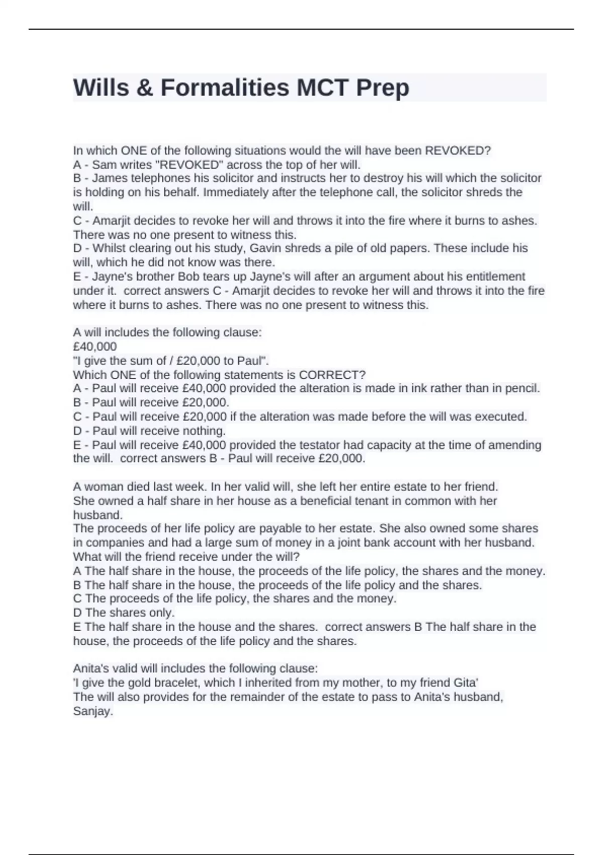 E The gold bracelet will pass to the beneficiaries of Gita's will correct answers C The
