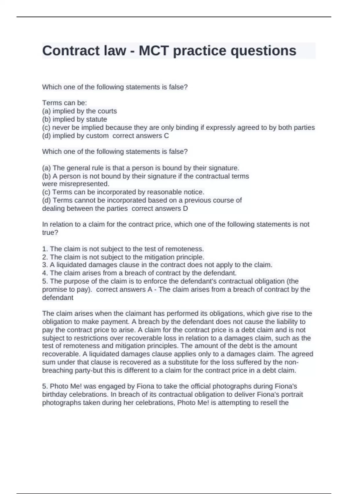 Which one of the following statements is false? Terms can be: (a) implied by the courts (b) implied by statute (c) never be implied because they are only binding if expressly agreed to by both parties (d) implied by custom correct answers C Which one of the following statements is false? (a) The general rule is that a person is bound by their signature. (b) A person is not bound by their signature if the contractual terms were misrepresented. (c) Terms can be incorporated by reasonable notice. (d) Terms cannot be incorporated based on a previous course of dealing between the parties correct answers D In relation to a claim for the contract price, which one of the following statements is not true? 1. The claim is not subject to the test of remoteness. 2. The claim is not subject to the mitigation principle. 3. A liquidated damages clause in the contract does not apply to the claim. 4. The claim arises from a breach of contract by the defendant. 5. The purpose of the claim is to enforce the defendant's contractual obligation (the promise to pay). correct answers A - The claim arises from a breach of contract by the defendant The claim arises when the claimant has performed its obligations, which give rise to the obligation to make payment. A breach by the defendant does not cause the liability to pay the contract price to arise. A claim for the contract price is a debt claim and is not subject to restrictions over recoverable loss in relation to a damages claim, such as the test of remoteness and mitigation principles. The amount of the debt is the amount recoverable. A liquidated damages clause applies only to a damages claim. The agreed sum under that clause is recovered as a substitute for the loss suffered by the non-breaching party-but this is different to a claim for the contract price in a debt claim. 5. Photo Me! was engaged by Fiona to take the official photographs during Fiona's birthday celebrations. In breach of its contractual obligation to deliver Fiona's portrait photographs taken during her celebrations, Photo Me! is attempting to resell the photographs to a third party. Which one of the following most accurately describes the parties' legal position? (a) The photographs are unique to Fiona, with no substitute available, so it is likely that a specific performance will be awarded. (b) It is unlikely that Fiona will be awarded specific performance because it is generally unavailable as a remedy, but she will be entitled to an account of any profits made by Photo-Me! (c) Fiona's most likely remedy is substantial damages, awarded according to her lost expectation. (d) Fiona's most likely remedy is substantial damages, awarded according to the disappointment and distress she will have suffered. (e) Fiona correct answers A The most appropriate remedy here is specific performance. Specific performance may be available where damages would be inadequate. The most obvious case, as here, is where substitute performance is unavailable. Fiona's portrait photographs taken during her birthday party are unique to her with no substitute available.