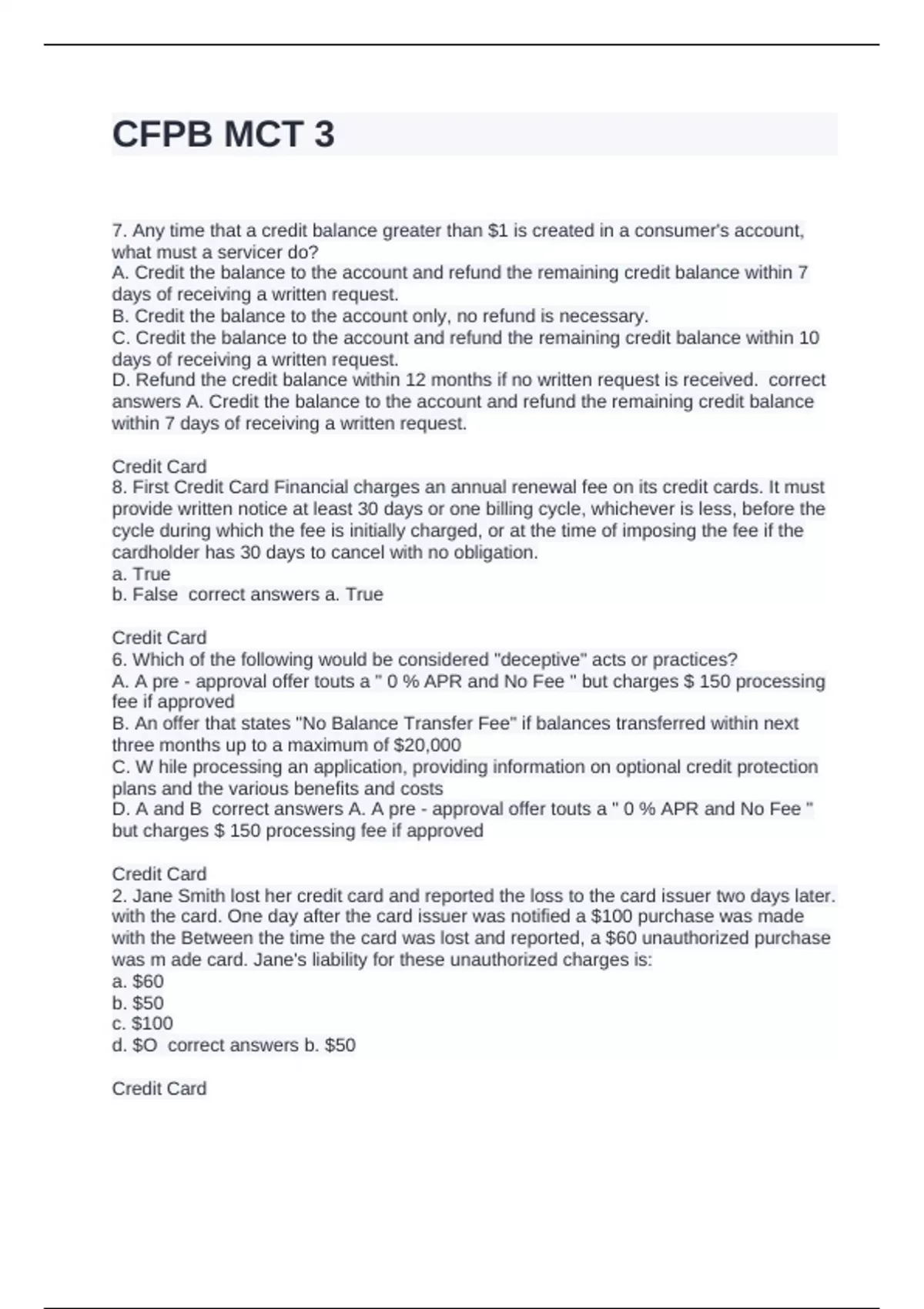 7. Any time that a credit balance greater than $1 is created in a consumer's account, what must a servicer do? A. Credit the balance to the account and refund the remaining credit balance within 7 days of receiving a written request. B. Credit the balance to the account only, no refund is necessary. C. Credit the balance to the account and refund the remaining credit balance within 10 days of receiving a written request. D. Refund the credit balance within 12 months if no written request is received. correct answers A. Credit the balance to the account and refund the remaining credit balance within 7 days of receiving a written request. Credit Card 8. First Credit Card Financial charges an annual renewal fee on its credit cards. It must provide written notice at least 30 days or one billing cycle, whichever is less, before the cycle during which the fee is initially charged, or at the time of imposing the fee if the cardholder has 30 days to cancel with no obligation. a. True b. False correct answers a. True Credit Card 6. Which of the following would be considered "deceptive" acts or practices? A. A pre - approval offer touts a " 0 % APR and No Fee " but charges $ 150 processing fee if approved B. An offer that states "No Balance Transfer Fee" if balances transferred within next three months up to a maximum of $20,000 C. W hile processing an application, providing information on optional credit protection plans and the various benefits and costs D. A and B correct answers A. A pre - approval offer touts a " 0 % APR and No Fee " but charges $ 150 processing fee if approved Credit Card 2. Jane Smith lost her credit card and reported the loss to the card issuer two days later. with the card. One day after the card issuer was notified a $100 purchase was made with the Between the time the card was lost and reported, a $60 unauthorized purchase was m ade card. Jane's liability for these unauthorized charges is: a. $60 b. $50 c. $100 d. $O correct answers b. $50 Credit Card
