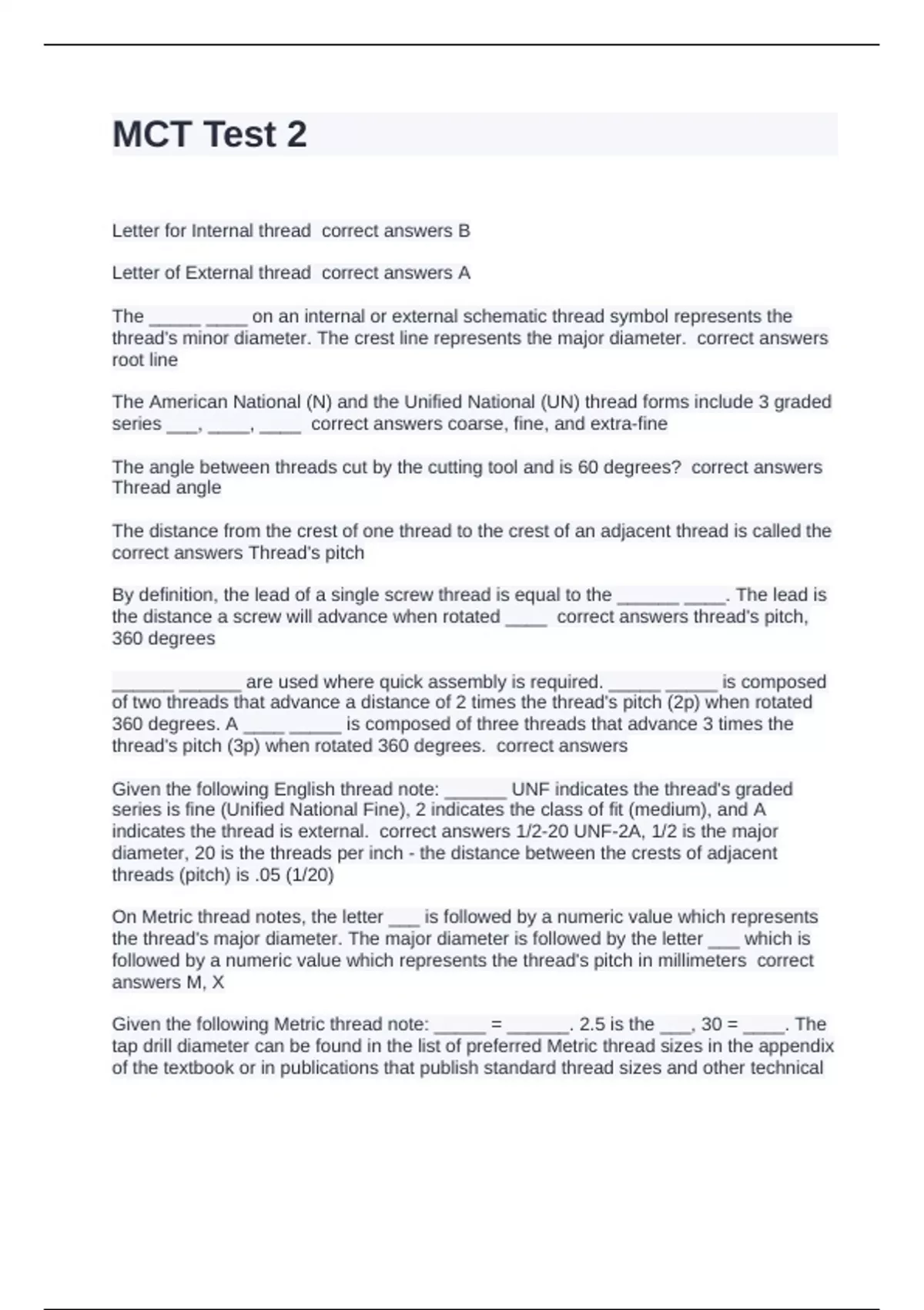 Letter for Internal thread correct answers B Letter of External thread correct answers A The _____ ____ on an internal or external schematic thread symbol represents the thread's minor diameter. The crest line represents the major diameter. correct answers root line The American National (N) and the Unified National (UN) thread forms include 3 graded series ___, ____, ____ correct answers coarse, fine, and extra-fine The angle between threads cut by the cutting tool and is 60 degrees? correct answers Thread angle The distance from the crest of one thread to the crest of an adjacent thread is called the correct answers Thread's pitch By definition, the lead of a single screw thread is equal to the ______ ____. The lead is the distance a screw will advance when rotated ____ correct answers thread's pitch, 360 degrees ______ ______ are used where quick assembly is required. _____ _____ is composed of two threads that advance a distance of 2 times the thread's pitch (2p) when rotated 360 degrees. A ____ _____ is composed of three threads that advance 3 times the thread's pitch (3p) when rotated 360 degrees. correct answers Given the following English thread note: ______ UNF indicates the thread's graded series is fine (Unified National Fine), 2 indicates the class of fit (medium), and A indicates the thread is external. correct answers 1/2-20 UNF-2A, 1/2 is the major diameter, 20 is the threads per inch - the distance between the crests of adjacent threads (pitch) is .05 (1/20) On Metric thread notes, the letter ___ is followed by a numeric value which represents the thread's major diameter. The major diameter is followed by the letter ___ which is followed by a numeric value which represents the thread's pitch in millimeters correct answers M, X Given the following Metric thread note: _____ = ______. 2.5 is the ___, 30 = ____. The tap drill diameter can be found in the list of preferred Metric thread sizes in the appendix of the textbook or in publications that