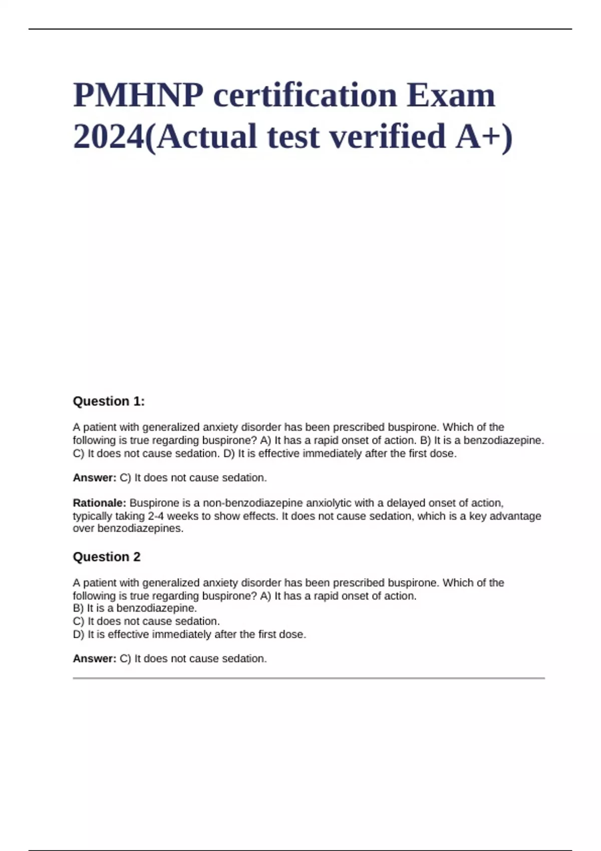 Rationale: Buspirone is a non-benzodiazepine anxiolytic with a delayed onset of action,
