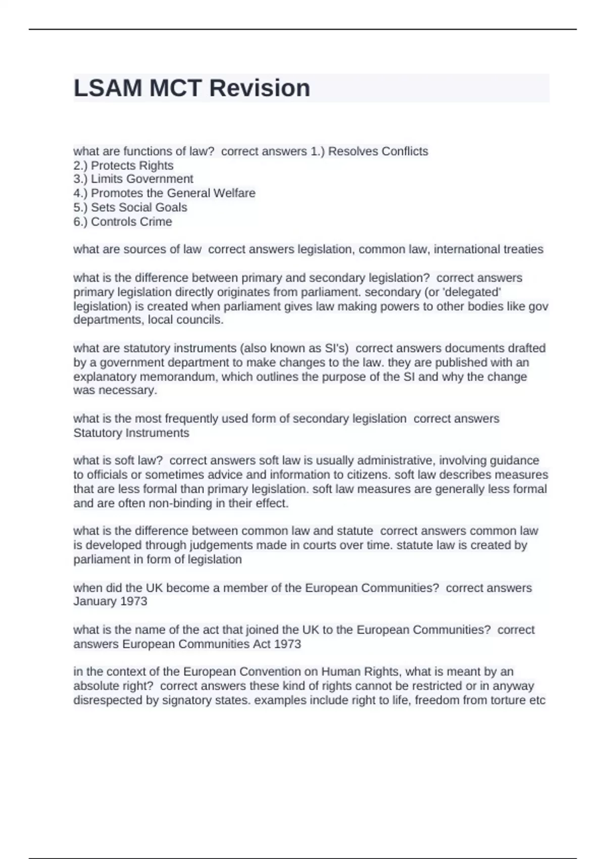 what are functions of law? correct answers 1.) Resolves Conflicts 2.) Protects Rights 3.) Limits Government 4.) Promotes the General Welfare 5.) Sets Social Goals 6.) Controls Crime what are sources of law correct answers legislation, common law, international treaties what is the difference between primary and secondary legislation? correct answers primary legislation directly originates from parliament. secondary (or 'delegated' legislation) is created when parliament gives law making powers to other bodies like gov departments, local councils. what are statutory instruments (also known as SI's) correct answers documents drafted by a government department to make changes to the law. they are published with an explanatory memorandum, which outlines the purpose of the SI and why the change was necessary. what is the most frequently used form of secondary legislation correct answers Statutory Instruments what is soft law? correct answers soft law is usually administrative, involving guidance to officials or sometimes advice and information to citizens. soft law describes measures that are less formal than primary legislation. soft law measures are generally less formal and are often non-binding in their effect. what is the difference between common law and statute correct answers common law is developed through judgements made in courts over time. statute law is created by parliament in form of legislation when did the UK become a member of the European Communities? correct answers January 1973 what is the name of the act that joined the UK to the European Communities? correct answers European Communities Act 1973 in the context of the European Convention on Human Rights, what is meant by an absolute right? correct answers these kind of rights cannot be restricted or in anyway disrespected by signatory states. examples include right to life, freedom from torture etc