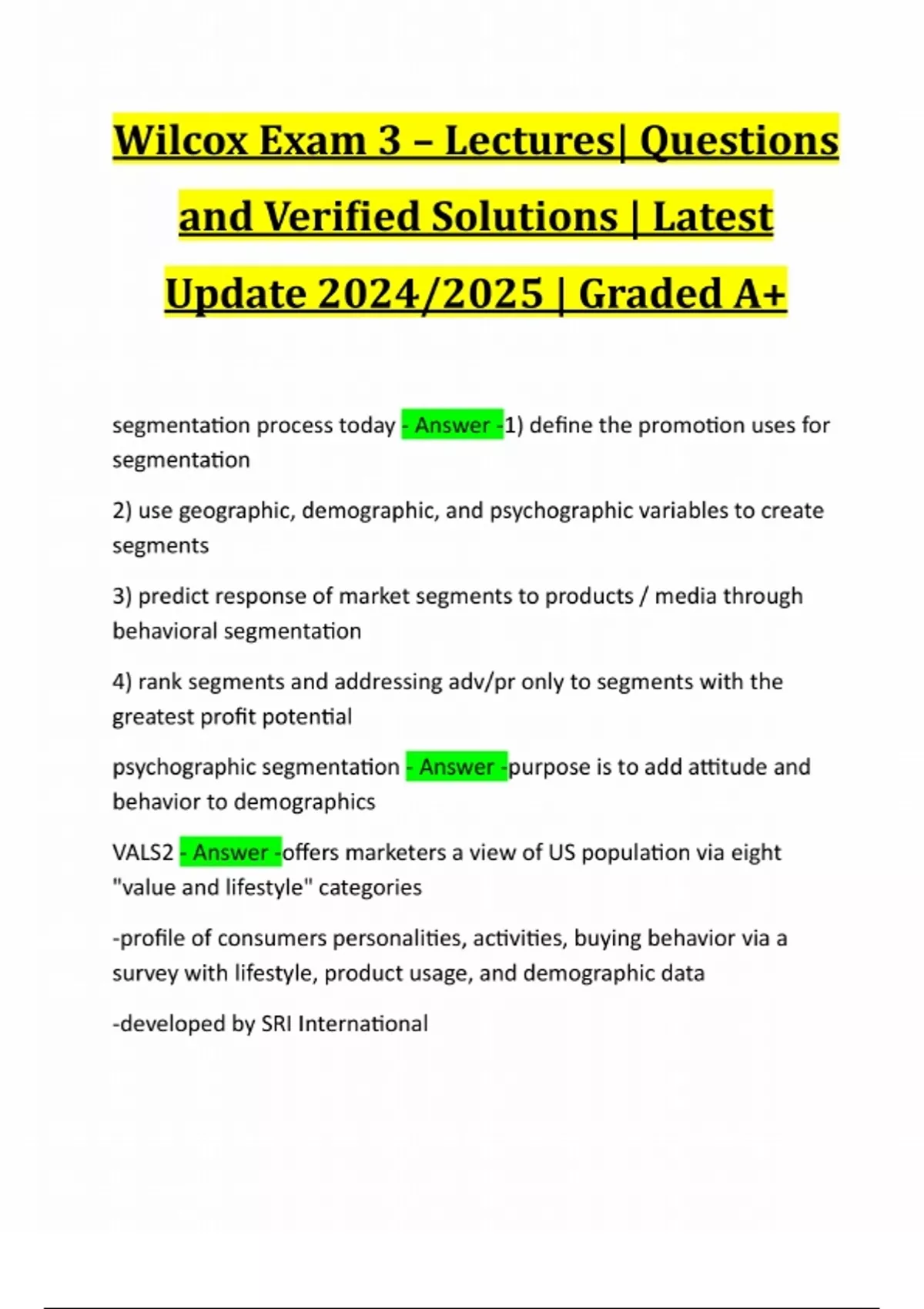 Wilcox Exam 3 – Lectures| Questions and Verified Solutions | Latest Update 2024/2025 | Graded A+ segmentation process today - Answer -1) define the promotion uses for segmentation 2) use geographic, demographic, and psychographic variables to create segments 3) predict response of market segments to products / media through behavioral segmentation 4) rank segments and addressing adv/pr only to segments with the greatest profit potential psychographic segmentation - Answer -purpose is to add attitude and behavior to demographics VALS2 - Answer -offers marketers a view of US population via eight "value and lifestyle" categories -profile of consumers personalities, activities, buying behavior via a survey with lifestyle, product usage, and demographic data -developed by SRI Internationa