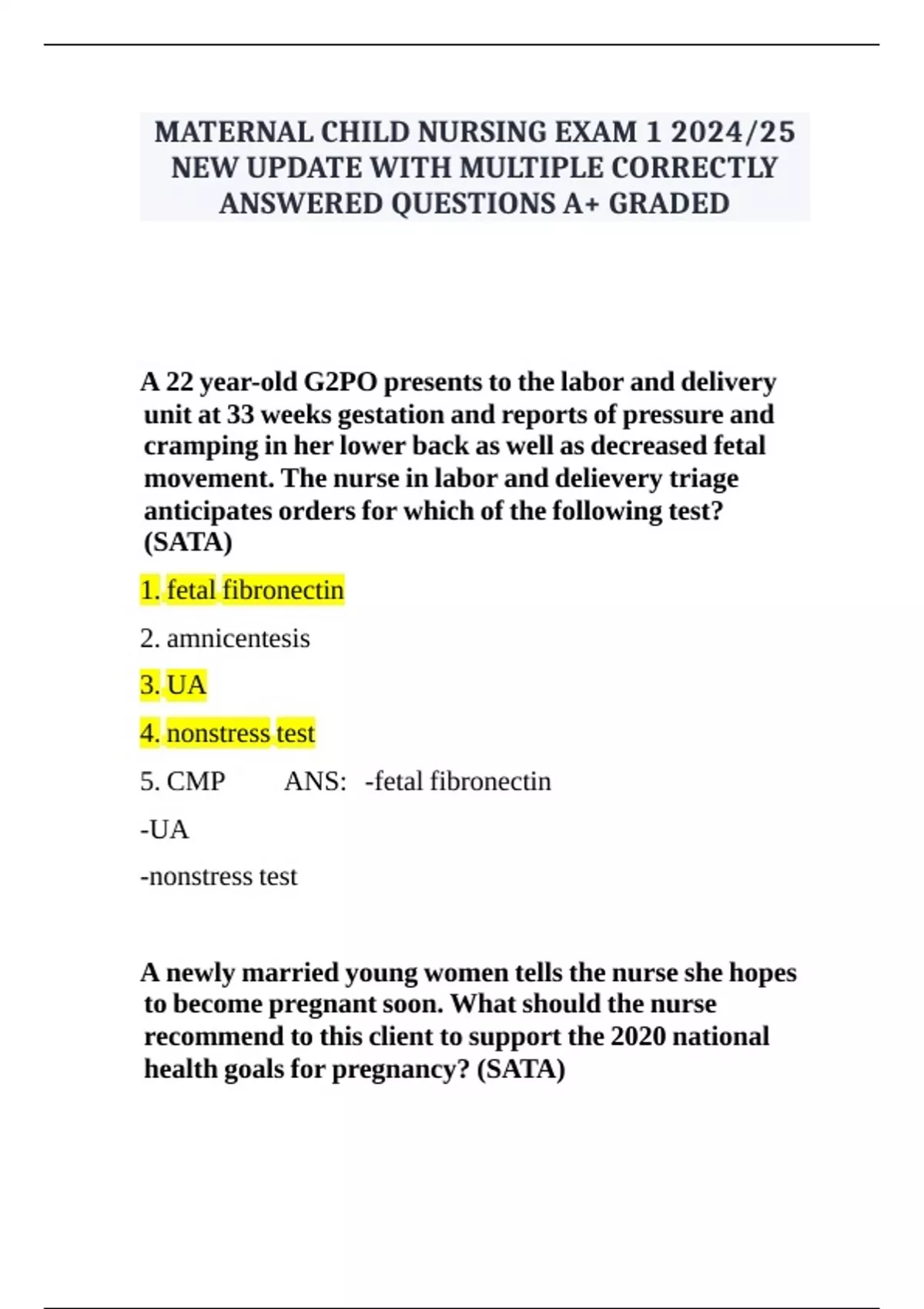 MATERNAL CHILD NURSING EXAM 1 2024/25 NEW UPDATE WITH MULTIPLE CORRECTLY ANSWERED QUESTIONS A+ GRADED