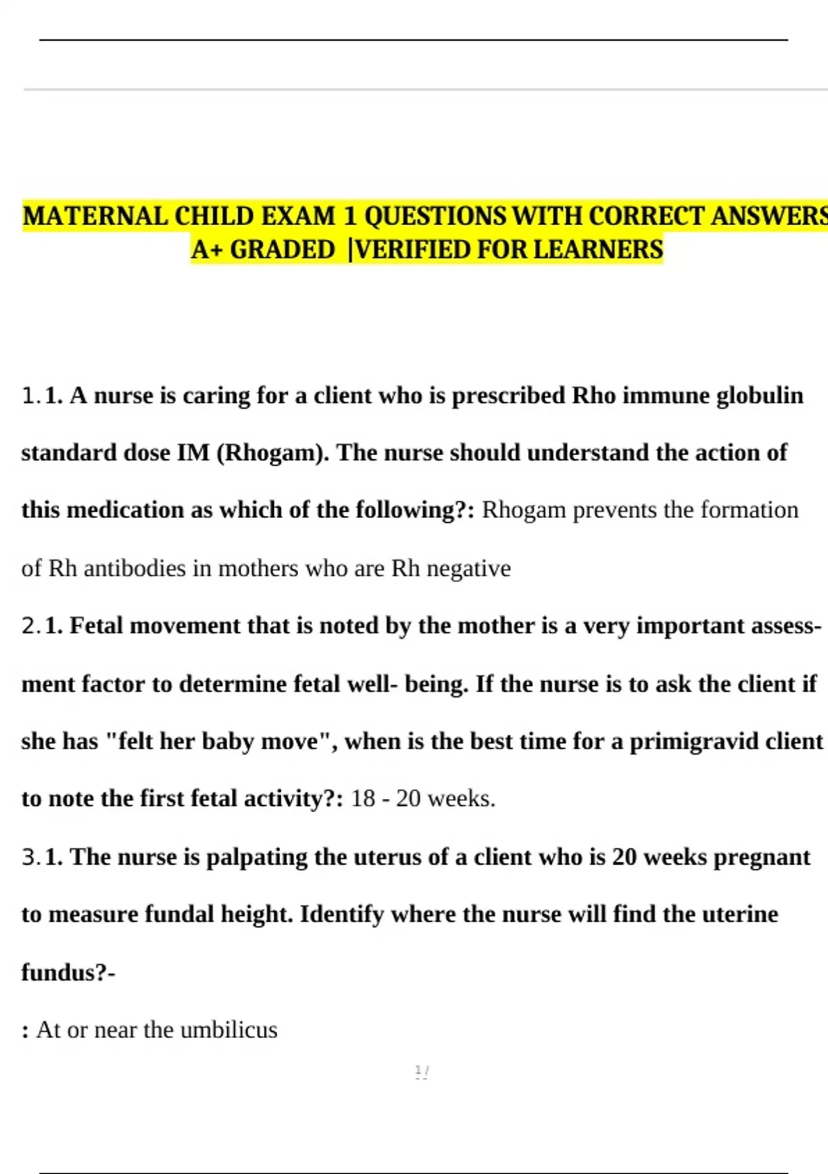 MATERNAL CHILD EXAM 1 QUESTIONS WITH CORRECT ANSWERS A+ GRADED |VERIFIED FOR LEARNERS