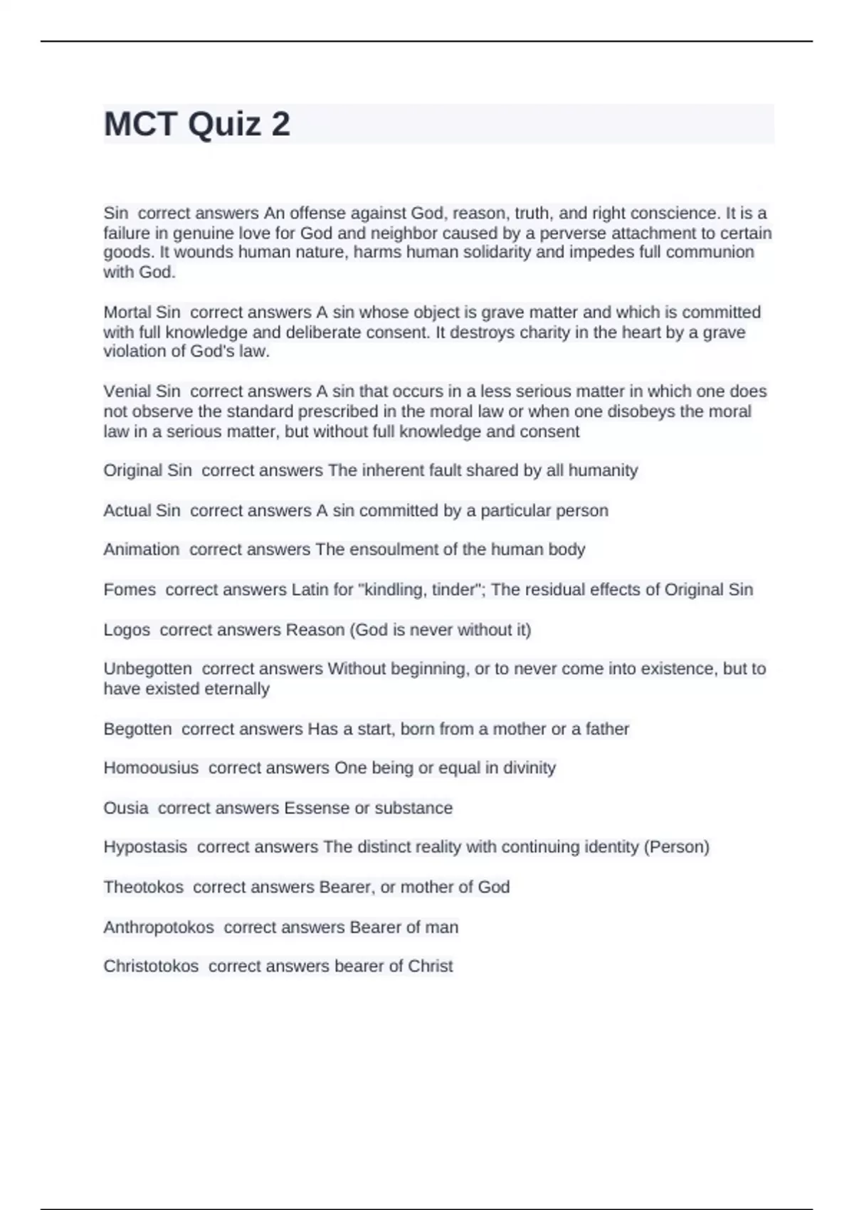 Sin correct answers An offense against God, reason, truth, and right conscience. It is a failure in genuine love for God and neighbor caused by a perverse attachment to certain goods. It wounds human nature, harms human solidarity and impedes full communion with God. Mortal Sin correct answers A sin whose object is grave matter and which is committed with full knowledge and deliberate consent. It destroys charity in the heart by a grave violation of God's law. Venial Sin correct answers A sin that occurs in a less serious matter in which one does not observe the standard prescribed in the moral law or when one disobeys the moral law in a serious matter, but without full knowledge and consent Original Sin correct answers The inherent fault shared by all humanity Actual Sin correct answers A sin committed by a particular person Animation correct answers The ensoulment of the human body Fomes correct answers Latin for "kindling, tinder"; The residual effects of Original Sin Logos correct answers Reason (God is never without it) Unbegotten correct answers Without beginning, or to never come into existence, but to have existed eternally Begotten correct answers Has a start, born from a mother or a father Homoousius correct answers One being or equal in divinity Ousia correct answers Essense or substance Hypostasis correct answers The distinct reality with continuing identity (Person) Theotokos correct answers Bearer, or mother of God Anthropotokos correct answers Bearer of man Christotokos correct answers bearer of Christ