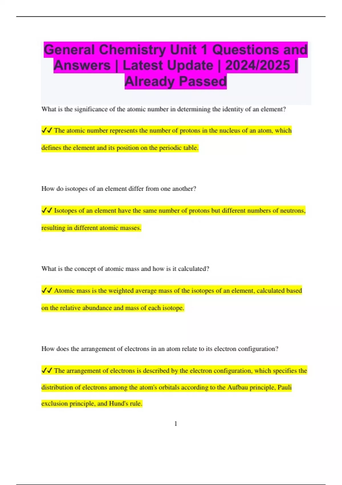 General Chemistry Unit 1 Questions and Answers | Latest Update | 2024/2025 | Already Passed What is the significance of the atomic number in determining the identity of an element? The atomic number represents the number of protons in the nucleus of an atom, which defines the element and its position on the periodic table. How do isotopes of an element differ from one another? Isotopes of an element have the same number of protons but different numbers of neutrons, resulting in different atomic masses. What is the concept of atomic mass and how is it calculated? Atomic mass is the weighted average mass of the isotopes of an element, calculated based on the relative abundance and mass of each isotope. How does the arrangement of electrons in an atom relate to its electron configuration? The arrangement of electrons is described by the electron configuration, which specifies the distribution of electrons among the atom's orbitals according to the Aufbau principle, Pauli exclusion principle, and Hund's rule. 2 What is the role of quantum numbers in describing the location and behavior of electrons in an atom? Quantum numbers describe the properties of atomic orbitals and the electrons within them, including the energy level, orbital shape, orientation, and spin. How do you determine the number of valence electrons in an atom, and why are they important? Valence electrons are determined by the outermost electron shell of an atom. They are important because they are involved in chemical bonding and reactions. What is the difference between a molecule and a compound? A molecule is a group of atoms bonded together, while a compound is a substance composed of two or more different elements chemically bonded in fixed proportions. How does the concept of periodicity help in understanding the properties of elements? Periodicity refers to the recurring trends in element properties across different periods and groups in the periodic table, helping to predict and explain the behavior of elements.