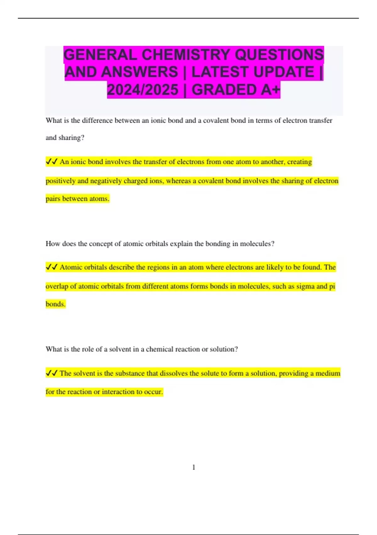GENERAL CHEMISTRY QUESTIONS AND ANSWERS | LATEST UPDATE | 2024/2025 | GRADED A+ What is the difference between an ionic bond and a covalent bond in terms of electron transfer and sharing? An ionic bond involves the transfer of electrons from one atom to another, creating positively and negatively charged ions, whereas a covalent bond involves the sharing of electron pairs between atoms. How does the concept of atomic orbitals explain the bonding in molecules? Atomic orbitals describe the regions in an atom where electrons are likely to be found. The overlap of atomic orbitals from different atoms forms bonds in molecules, such as sigma and pi bonds. What is the role of a solvent in a chemical reaction or solution? The solvent is the substance that dissolves the solute to form a solution, providing a medium for the reaction or interaction to occur. 2 How does the concept of electronegativity help predict the type of bond formed between two atoms? Electronegativity measures an atom’s ability to attract and hold onto electrons. A large difference in electronegativity between two atoms usually indicates an ionic bond, while a small difference suggests a covalent bond. What is the significance of the octet rule in chemical bonding? The octet rule states that atoms tend to bond in such a way that they achieve a full outer shell of eight electrons, similar to the electron configuration of noble gases, leading to stable compounds. How do you determine the oxidation state of an element in a compound? The oxidation state of an element in a compound can be determined by assigning oxidation numbers based on a set of rules, including the assumption that the sum of oxidation states equals the charge of the compound. What is the concept of chemical equilibrium and how is it represented in a chemical reaction? Chemical equilibrium occurs when the rates of the forward and reverse reactions are equal, and the concentrations of reactants and products remain constant over time. 3 How does the principle of conservation of mass apply to chemical reactions? The principle of conservation of mass states that in a chemical reaction, mass is neither created nor destroyed; the total mass