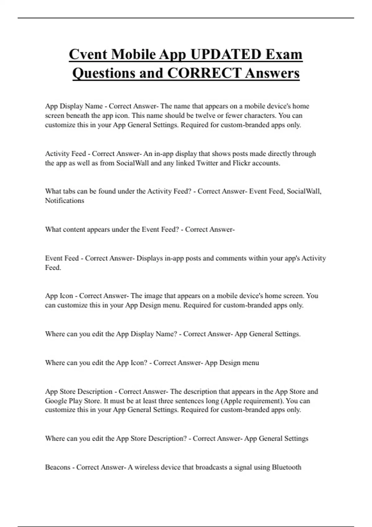 Cvent Mobile App UPDATED Exam Questions and CORRECT Answers App Display Name - Correct Answer- The name that appears on a mobile device's home screen beneath the app icon. This name should be twelve or fewer characters. You can customize this in your App General Settings. Required for custom-branded apps only. Activity Feed - Correct Answer- An in-app display that shows posts made directly through the app as well as from SocialWall and any linked Twitter and Flickr accounts. What tabs can be found under the Activity Feed? - Correct Answer- Event Feed, SocialWall, Notifications