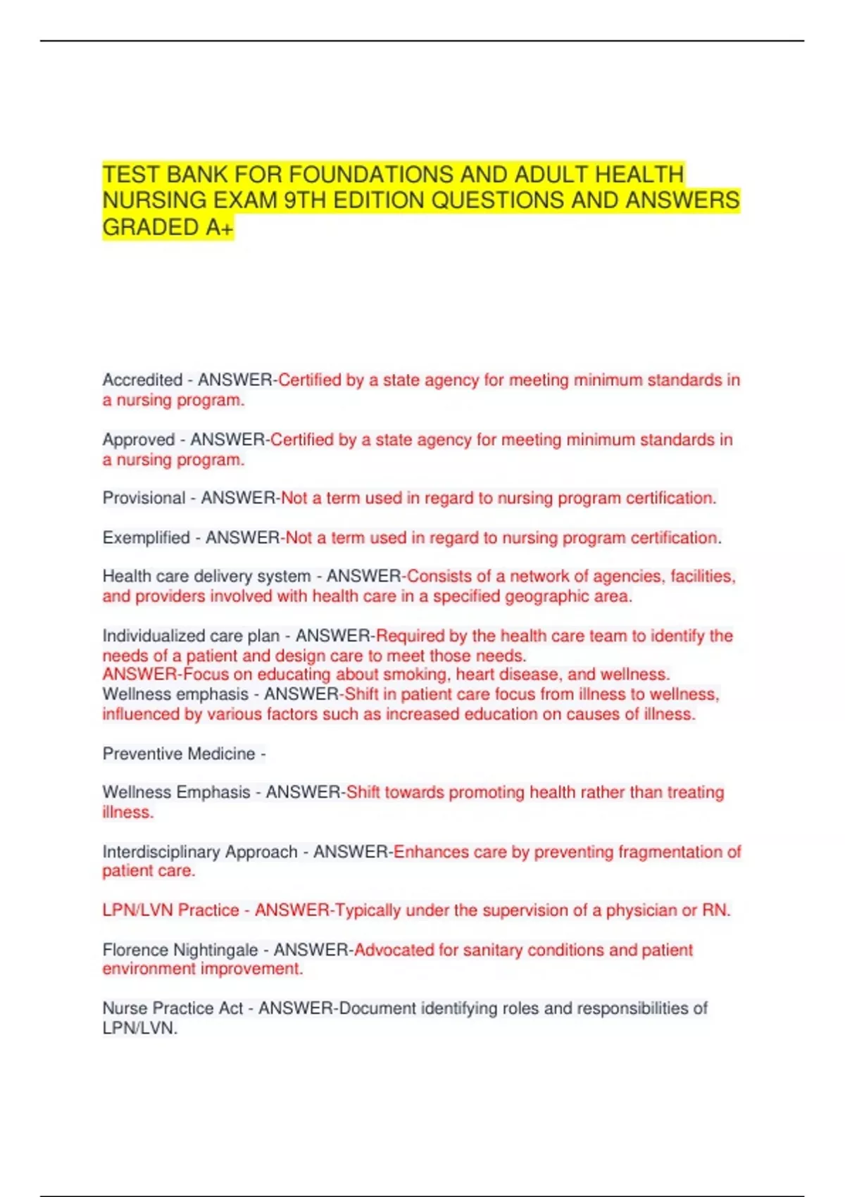 TEST BANK FOR FOUNDATIONS AND ADULT HEALTH