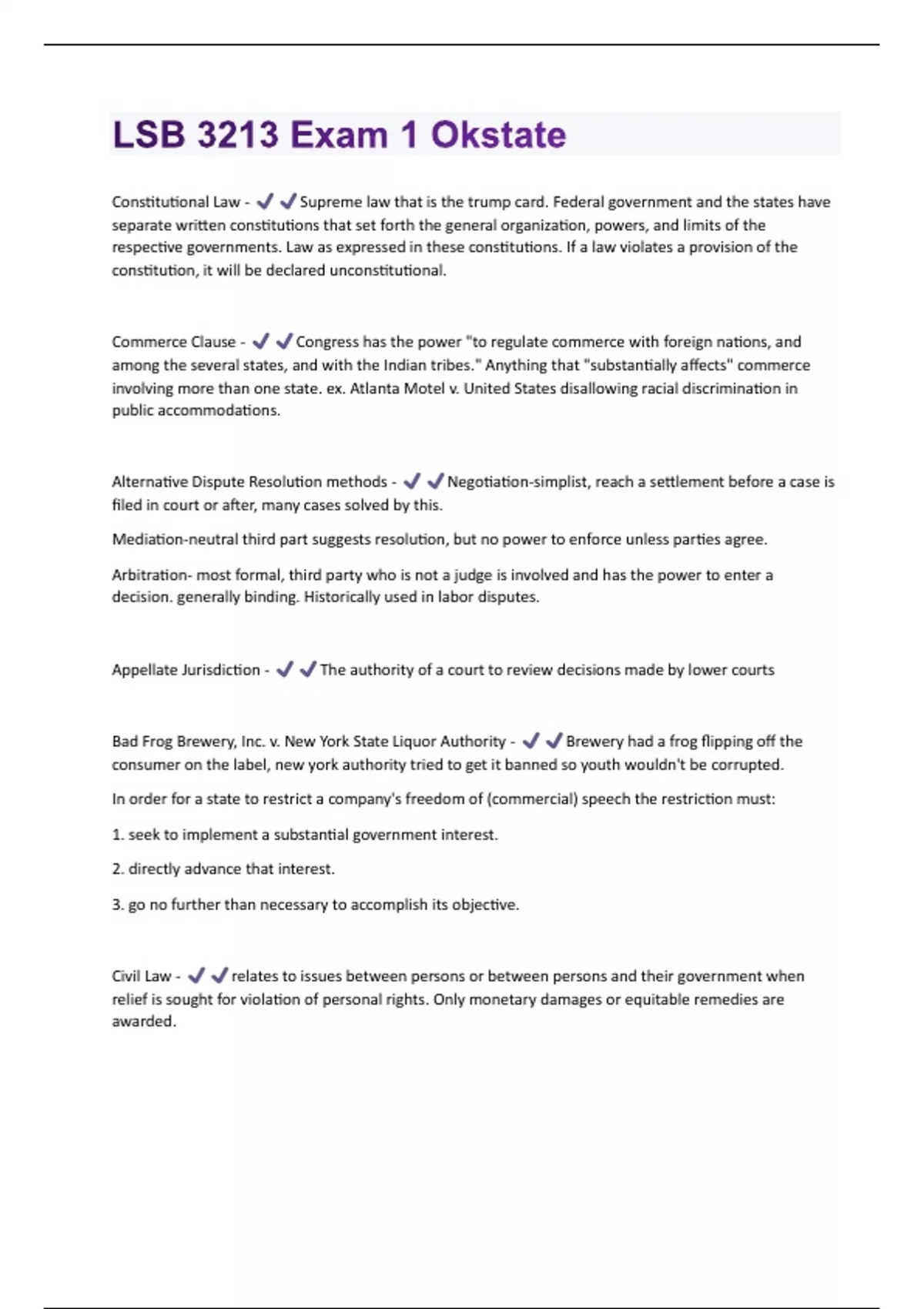 Constitutional Law - Supreme law that is the trump card. Federal government and the states have separate written constitutions that set forth the general organization, powers, and limits of the respective governments. Law as expressed in these constitutions. If a law violates a provision of the constitution, it will be declared unconstitutional. Commerce Clause - Congress has the power "to regulate commerce with foreign nations, and among the several states, and with the Indian tribes." Anything that "substantially affects" commerce involving more than one state. ex. Atlanta Motel v. United States disallowing racial discrimination in public accommodations. Alternative Dispute Resolution methods - Negotiation-simplist, reach a settlement before a case is filed in court or after, many cases solved by this. Mediation-neutral third part suggests resolution, but no power to enforce unless parties agree. Arbitration- most formal, third party who is not a judge is involved and has the power to enter a decision. generally binding. Historically used in labor disputes. Appellate Jurisdiction - The authority of a court to review decisions made by lower courts Bad Frog Brewery, Inc. v. New York State Liquor Authority - Brewery had a frog flipping off the consumer on the label, new york authority tried to get it banned so youth wouldn't be corrupted. In order for a state to restrict a company's freedom of (commercial) speech the restriction must: 1. seek to implement a substantial government interest. 2. directly advance that interest. 3. go no further than necessary to accomplish its objective. Civil Law - relates to issues between persons or between persons and their government when relief is sought for violation of personal rights. Only monetary damages or equitable remedies are awarded.Common Law - Common law is defined as a body of legal rules that have been made by judges as they issue rulings on cases, as opposed to rules and laws made by the legislature or in official statutes. An example of common law is a rule that a judge made that says that people have a duty to read contracts. Concurrent Jurisdiction - when both federal and state courts have the power to hear a case (diversity of citizenship) Concurring Opinionn - separate opinion written by a justice on the winning side but which outlines his or her legal reasoning which differs from the reasoning of the majority, reaches the same conclusion nevertheless. Corporate Contacts - Courts apply minimum contacts test to determine if they can exercise jurisdiction over a corporation that is out of state. Minimum contacts requirement is usually met if the corporation advertises or sells its products within the state or places its goods into the "stream of commerce". Court of General Jurisdiction - a court that can hear nearly any type of case Court of Limited Jurisdiction - can only hear specific types of cases. (ex. Probate court regarding personal assets after death, custody). Criminal Law - wrongs committed against society as a whole. prosecuted by public officials on behalf of the public as a whole, not just the victim. Only in criminal law will defendant ever face the possibility of imprisonment. Plaintiff is an authority. Defendant (or respondent) - the party against whom a lawsuit is brought. (lawsuits frequently involve more than one plaintiff and/ or defendant.) Dissenting Opinion - presents the views of one or more judges who disagree with the majority view. they wish to leave their viewpoints on record for future lawyers or judges to argue for a change in the precedent.Equal Protection Clause - The government must treat similarly situated individuals (or businesses) in the same manner. Different rights are protected more vigorously than others. 1. strict scrutiny- fundamental rights (voting) 2. Intermediate scrutiny- gender or legitimacy 3. Rational basis test- economic or social welfare. Exclusive Jurisdiction - authority of only federal courts to hear and decide cases Federal Jurisdiction - Limited powers, they have subject matter jurisdiction in two situationswhen a federal question is involved and when there is a diversity of citizenship. First Amendment Freedom of Speech protects what? - Political speech is highly protected. Symbolic speech. Commercial speech is protected but to a lesser degree than political. Obscenity speech has NO protection. General Jurisdiction in Trail Courts - county, district, superior, or circuit courts. Jurisdiction over a wide variety of subjects including both civil disputes and criminal prosecutions. in personam jurisdiction - personal jurisdiction over any person or business that resides in a certain geographic area. in rem jurisdiciton - court exercising jurisdiction over property that is located within its boundaries (jurisdiction over the thing). Is minority opinion an option? - No. No such thing. Jurisdiction - "the power to speak the law"