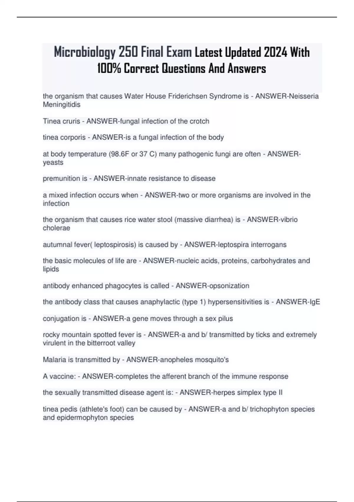 Microbiology 250 Final Exam Latest Updated 2024 With 100% Correct Questions And Answers the organism that causes Water House Friderichsen Syndrome is - ANSWER-Neisseria Meningitidis Tinea cruris - ANSWER-fungal infection of the crotch tinea corporis - ANSWER-is a fungal infection of the body at body temperature (98.6F or 37 C) many pathogenic fungi are often - ANSWER-yeasts premunition is - ANSWER-innate resistance to disease a mixed infection occurs when - ANSWER-two or more organisms are involved in the infection the organism that causes rice water stool (massive diarrhea) is - ANSWER-vibrio cholerae autumnal fever( leptospirosis) is caused by - ANSWER-leptospira interrogans the basic molecules of life are - ANSWER-nucleic acids, proteins, carbohydrates and lipids antibody enhanced phagocytes is called - ANSWER-opsonization the antibody class that causes anaphylactic (type 1) hypersensitivities is - ANSWER-IgE conjugation is - ANSWER-a gene moves through a sex pilus rocky mountain spotted fever is - ANSWER-a and b/ transmitted by ticks and extremely virulent in the bitterroot valley Malaria is transmitted by - ANSWER-anopheles mosquito's A vaccine: - ANSWER-completes the afferent branch of the immune response the sexually transmitted disease agent is: - ANSWER-herpes simplex type II tinea pedis (athlete's foot) can be caused by - ANSWER-a and b/ trichophyton species and epidermophyton species delayed type hypersensitivity T cells are - ANSWER-CD4+ which are the cytotoxic lymphocytes? - ANSWER-CD8+ T cells Histoplasma capsulatum is an - ANSWER-systemic mycosis an intestinal parasite often associated with cats and fetal damage in humans is - ANSWER-toxoplasma gondii oral thrush is caused by - ANSWER-candida albicans coccidioides immitis infections are limited to what region of the US? - ANSWER-Southwestern United States (Sonoran Zone) yeast vaginitis is caused by - ANSWER-candida albicans most fungi - ANSWER-feed on dead and decaying material (saprophytes) Schistosoma species go through a developmental stage in - ANSWER-water snails which of the following helps make a molecule a good immunogen? - ANSWER-large mass and complexity the complete virus particle is called - ANSWER-a viron cells which can initiate the inflammatory response are - ANSWER-mast cells giardia lamblia causes - ANSWER-steatorrhoea flossing helps prevent - ANSWER-cavities ( caries