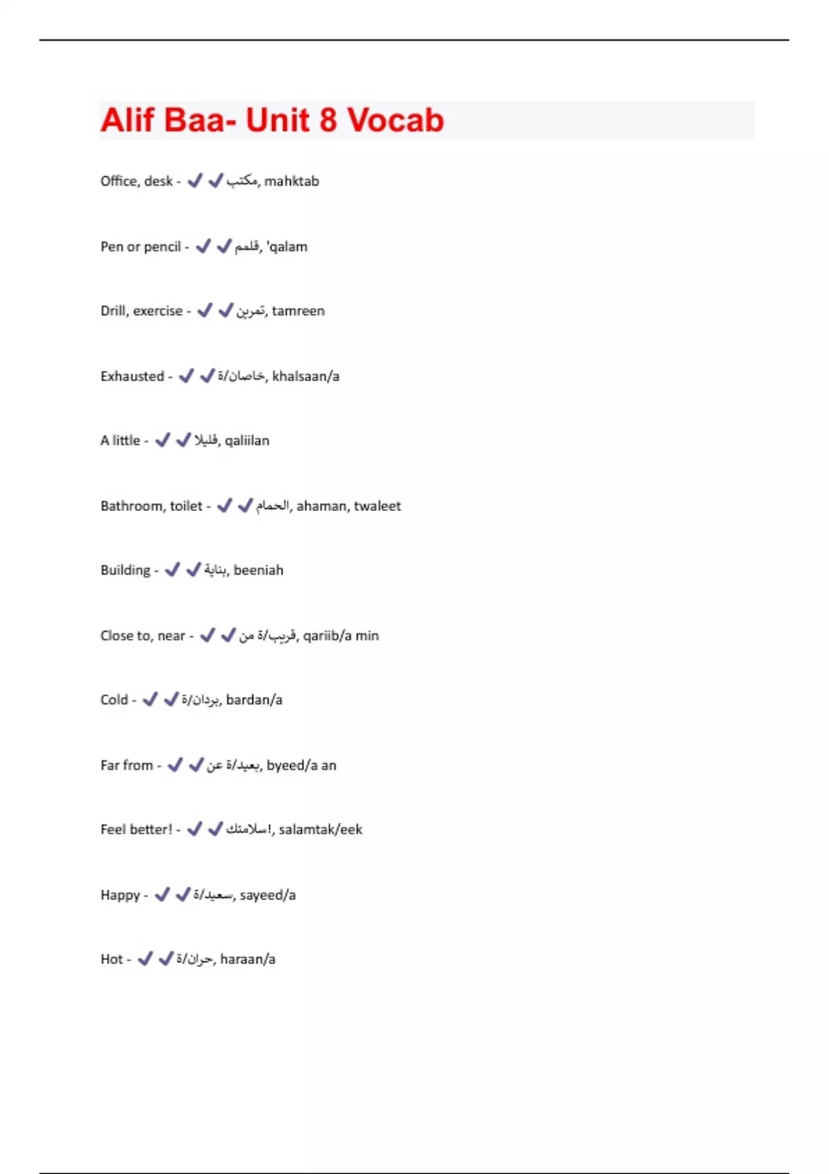 Office, desk - ,مكتبmahktab Pen or pencil - ' ,قلممqalam Drill, exercise - ,تمرينtamreen Exhausted - ,خاصان/ةkhalsaan/a A little - ,قليلاqaliilan Bathroom, toilet - ,الحمامahaman, twaleet Building - ,بنايةbeeniah Close to, near - ,قريب/ة منqariib/a min Cold - ,بردان/ةbardan/a Far from - ,بعيد/ة عنbyeed/a an Feel better! - ,,سلامتكsalamtak/eek Happy - ,سعيد/ةsayeed/a Hot - ,حران/ةharaan/aHungry - ,جوعان/ةjhooan/a Library, bookstore - ,مكتبةmahktaba Response to (feel better) - ,الله يسامكallah ysallmak/ik Sentence - جملةjhoomla Sick - ,مريض/ةmariida Test, exam - ,امتحانimtihan