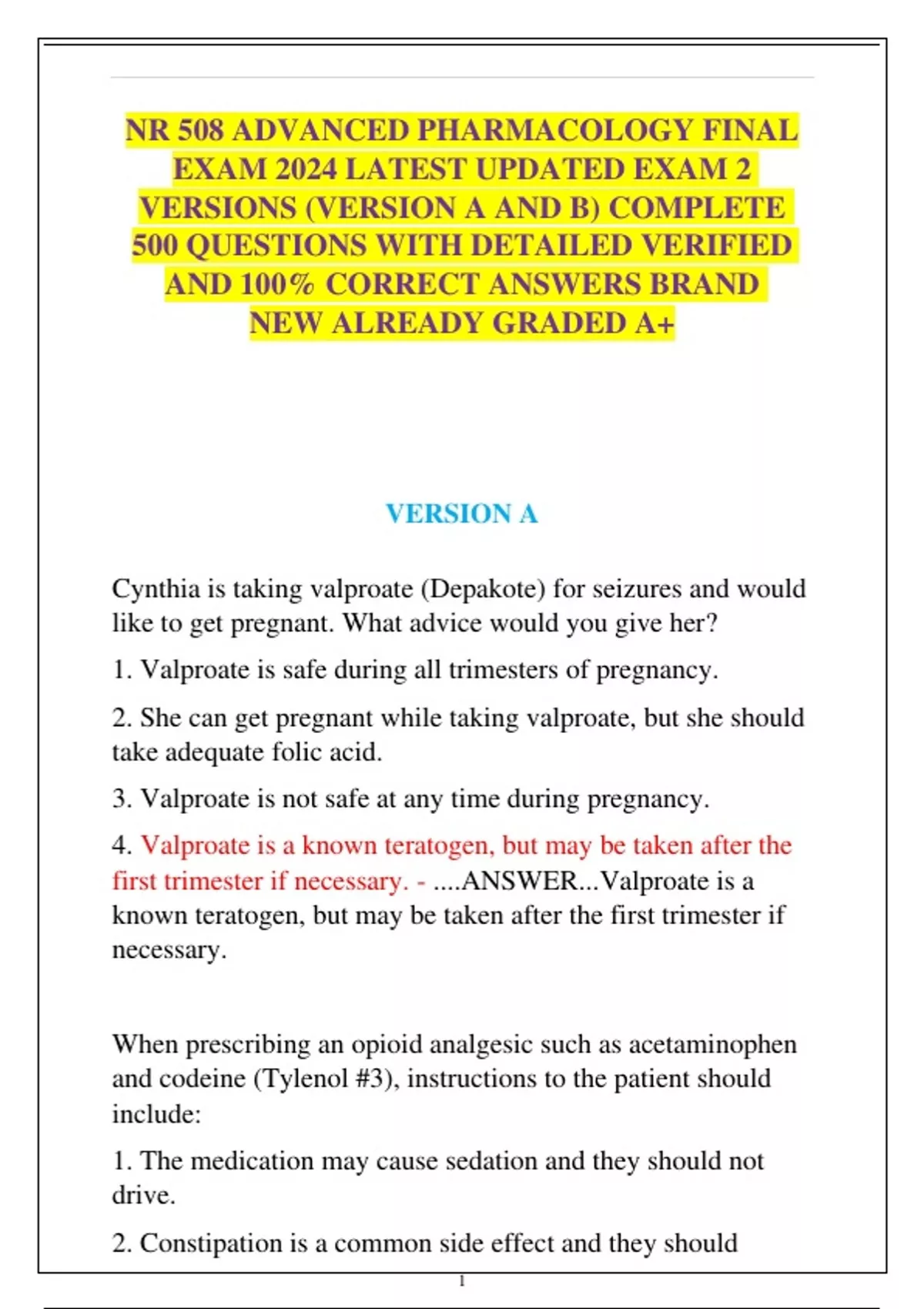 NR 508 ADVANCED PHARMACOLOGY FINAL EXAM 2024 LATEST UPDATED EXAM 2 VERSIONS (VERSION A AND B) COMPLETE 500 QUESTIONS WITH DETAILED VERIFIED AND 100% CORRECT ANSWERS BRAND NEW ALREADY GRADED A+