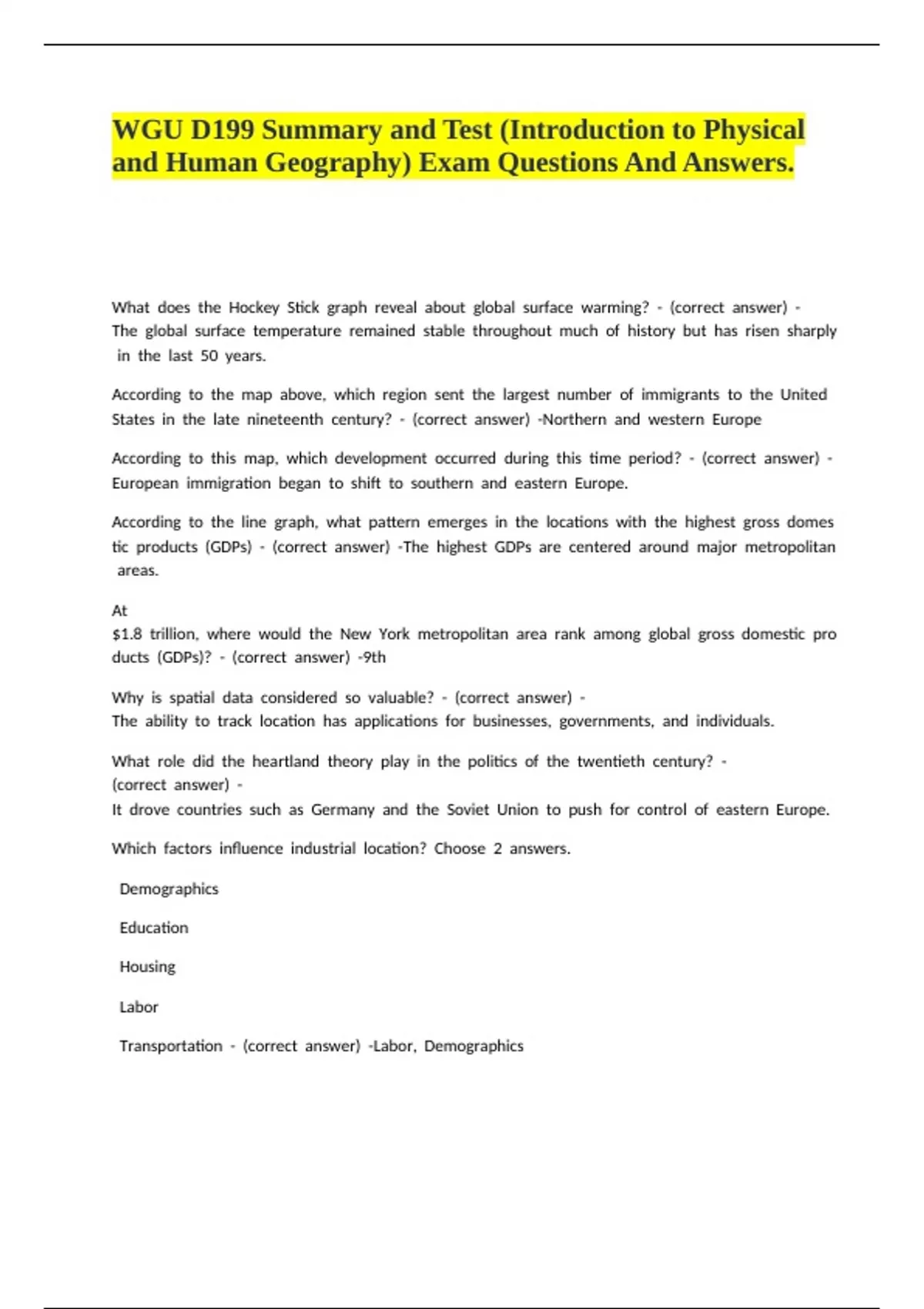 WGU D199 Summary and Test (Introduction to Physical and Human Geography) Exam Questions And
