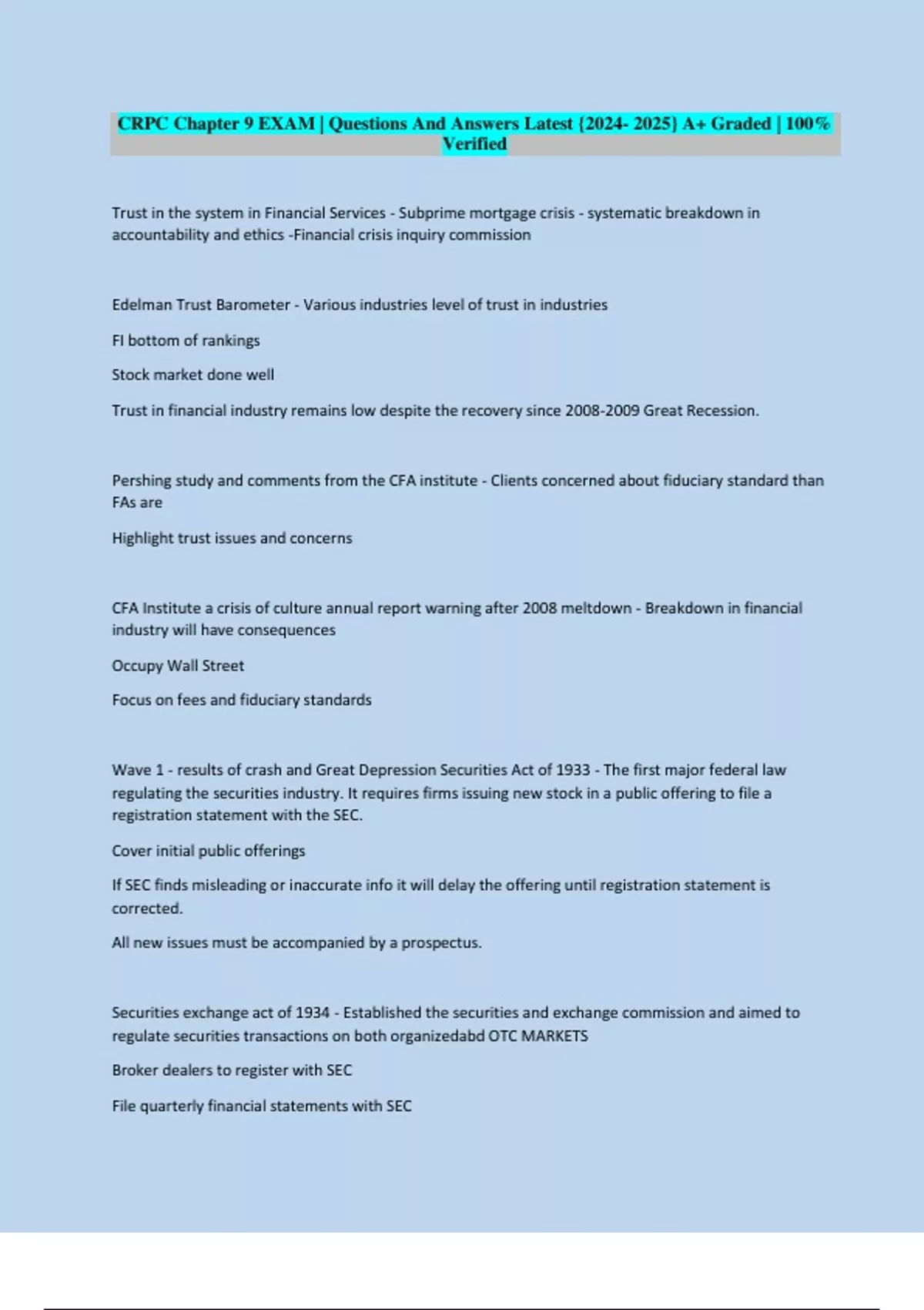 Wave 1 - results of crash and Great Depression Securities Act of 1933 - The first major federal law