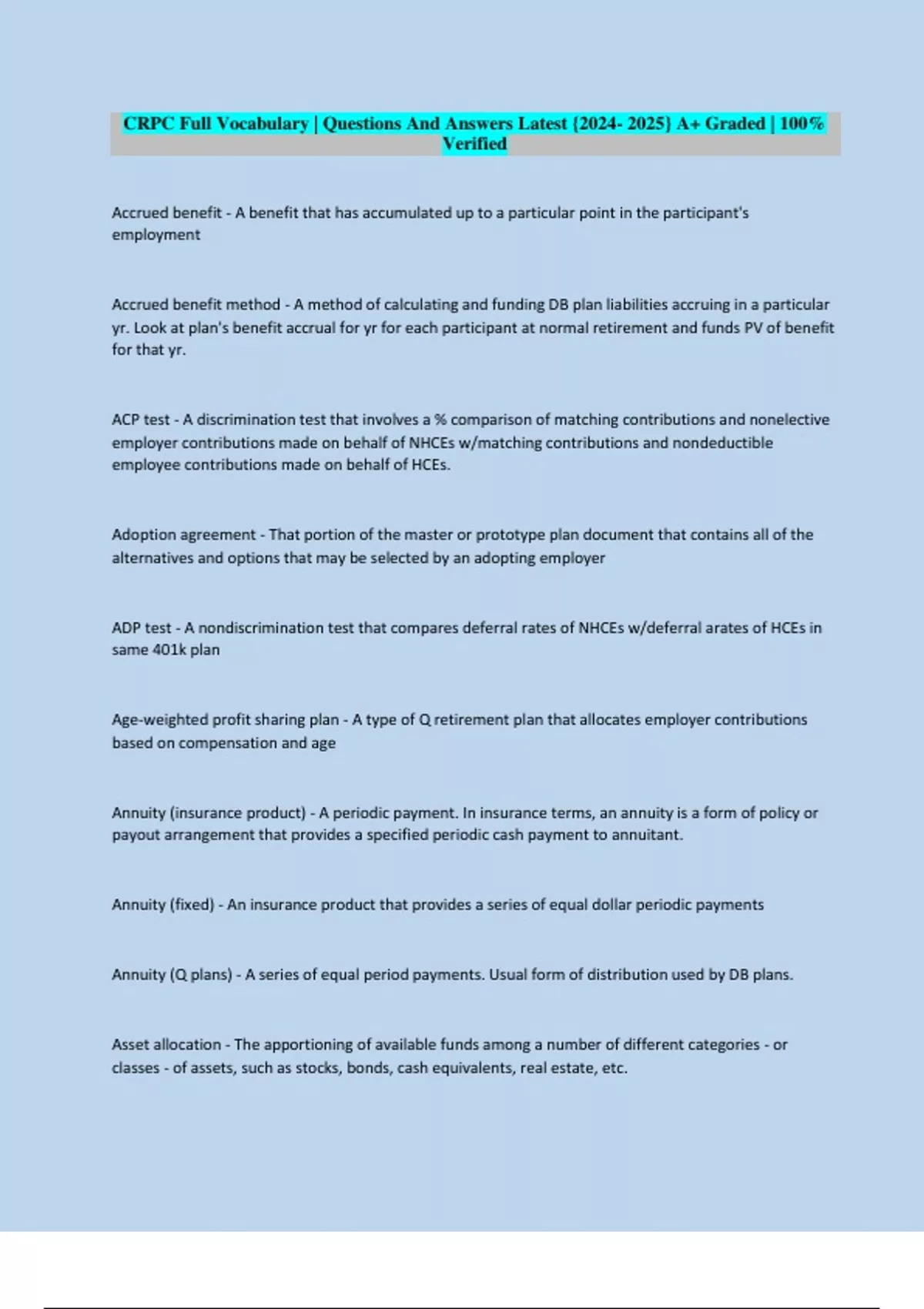 CRPC Full Vocabulary | Questions And Answers Latest {} A+ Graded | 100% Verified