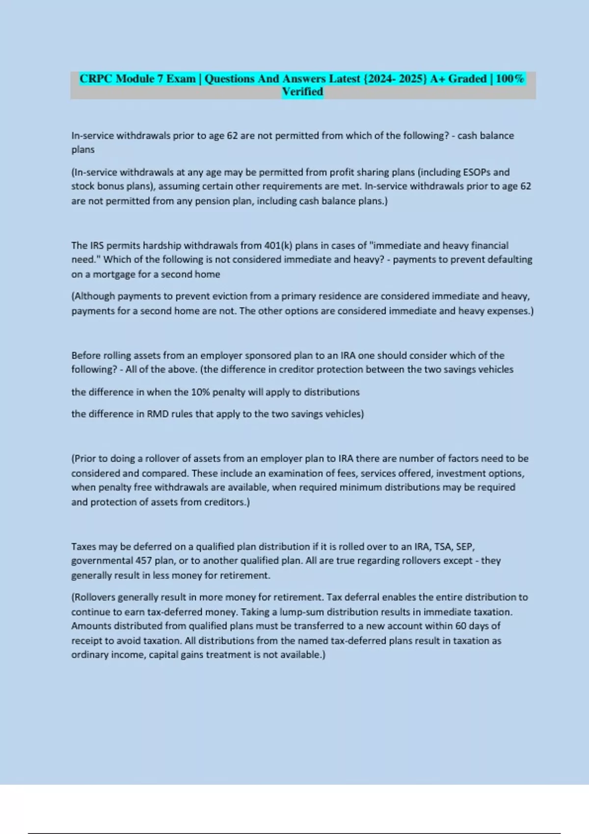 CRPC Module 7 Exam | Questions And Answers Latest {} A+ Graded | 100% Verified