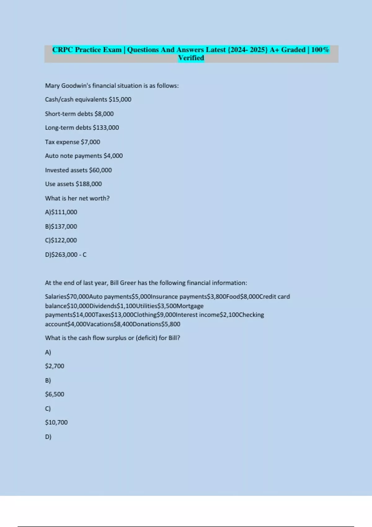 CRPC Practice Exam | Questions And Answers Latest {2024- 2025} A+ Graded | 100%
