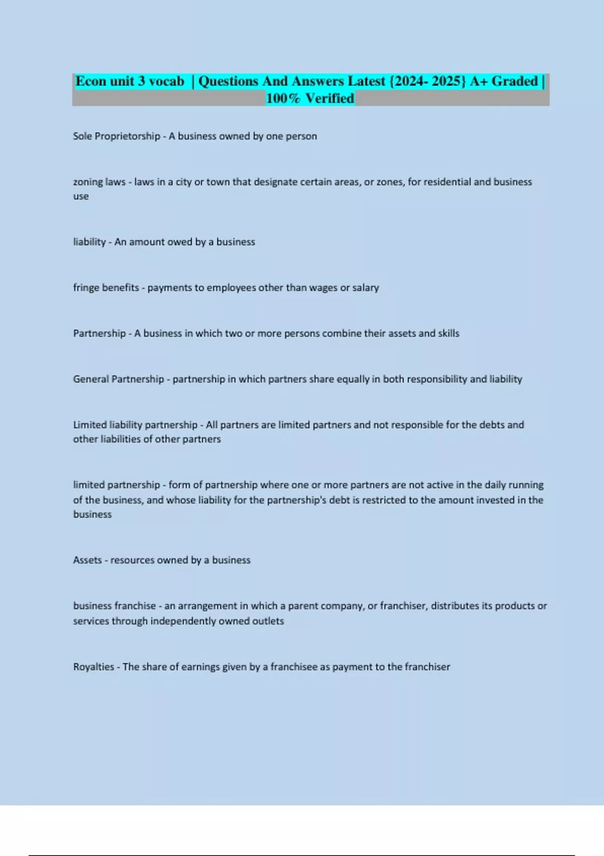 Sole Proprietorship - A business owned by one person