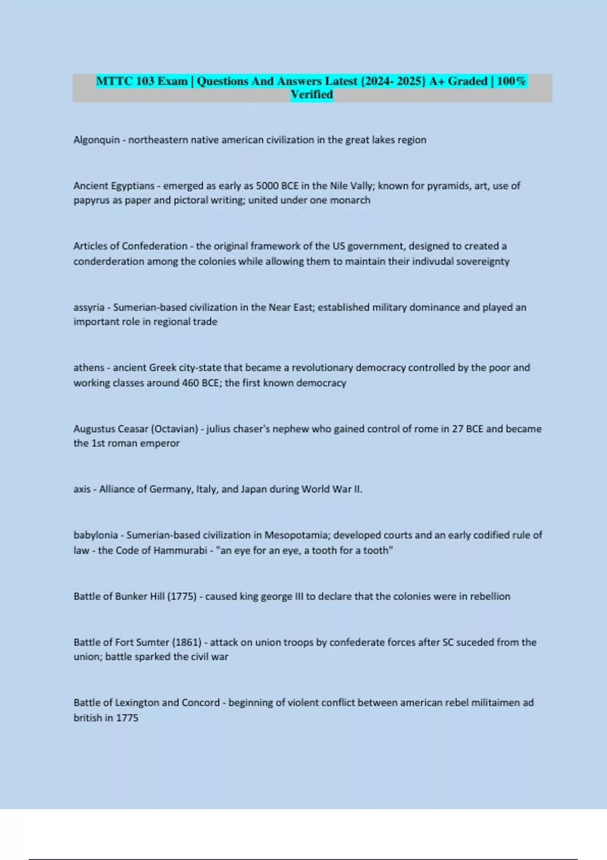 Ancient Egyptians - emerged as early as 5000 BCE in the Nile Vally; known for pyramids, art, use of
