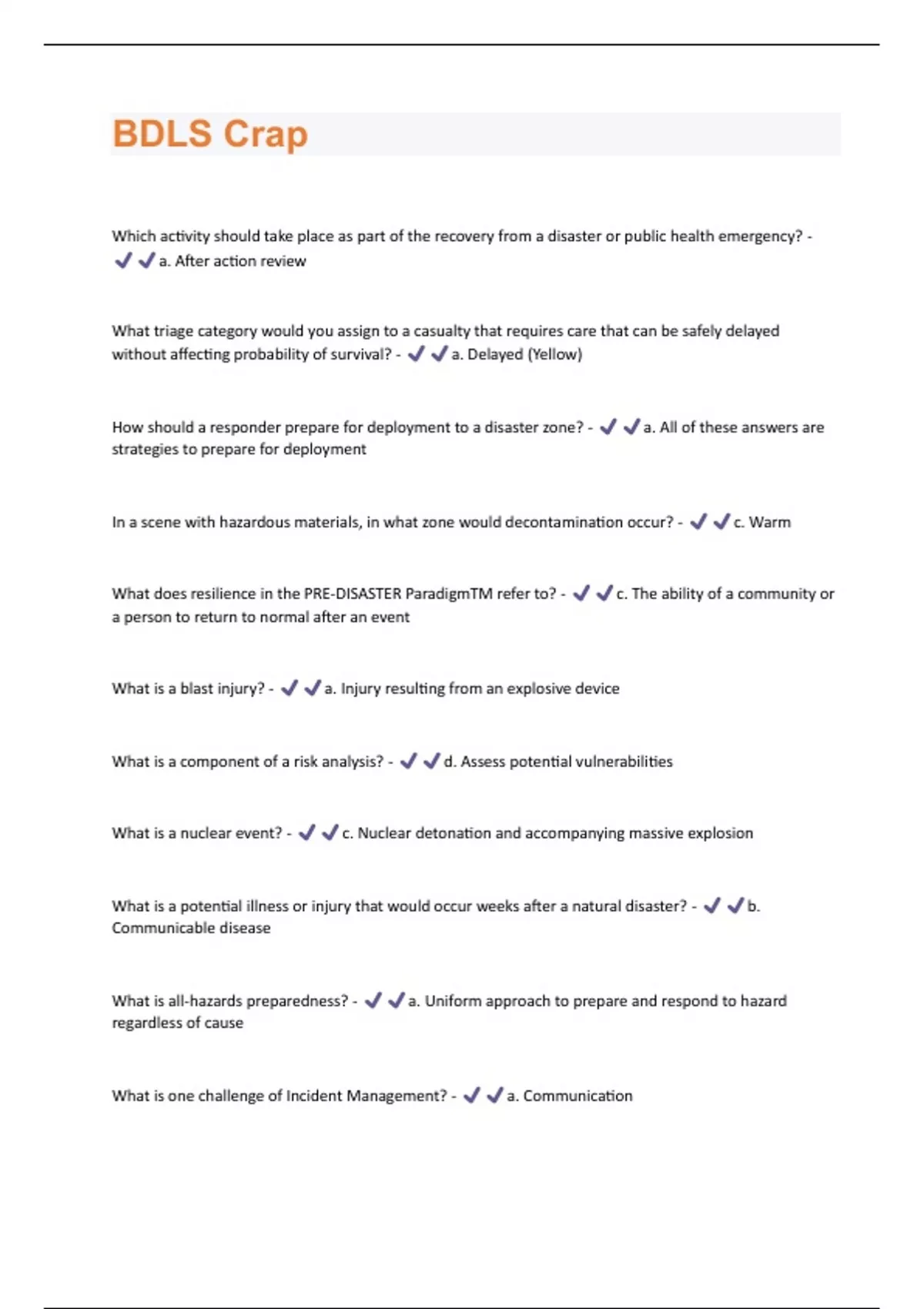 Which activity should take place as part of the recovery from a disaster or public health emergency? - a. After action review What triage category would you assign to a casualty that requires care that can be safely delayed without affecting probability of survival? - a. Delayed (Yellow) How should a responder prepare for deployment to a disaster zone? - a. All of these answers are strategies to prepare for deployment In a scene with hazardous materials, in what zone would decontamination occur? - c. Warm What does resilience in the PRE-DISASTER ParadigmTM refer to? - c. The ability of a community or a person to return to normal after an event What is a blast injury? - a. Injury resulting from an explosive device What is a component of a risk analysis? - d. Assess potential vulnerabilities What is a nuclear event? - c. Nuclear detonation and accompanying massive explosion What is a potential illness or injury that would occur weeks after a natural disaster? - b. Communicable disease What is all-hazards preparedness? - a. Uniform approach to prepare and respond to hazard regardless of cause What is one challenge of Incident Management? - a. CommunicationWhat is one essential component of a regional disaster plan? - c. Be created in advance What is one tool to help diagnose nerve agents? - b. DUMBELS What is the first priority of all citizens or responders? - d. Protect self from danger What is the first step of SALT mass casualty triage? - d. Sort What is the initial goal of mass casualty triage? - c. Sort and assess casualties, identifying lifethreatening injuries What is the most common disaster worldwide? - c. Flooding What sort of treatment may be performed prior to decontamination? - a. Life-saving interventions What type of injury is least common after a nuclear or radiological disaster? - d. Communicable disease When does treatment at the disaster scene end? - a. After all casualties transported from scene Which of the following account for most terror events worldwide? - b. Explosive devices Which of the following best defines the function of public health? - c. To recognize health threats that may affect communities Which of the following is a function of the public health system during a disaster? - b. Protect population against injury and diseaseWhich of the following is an example of a mental health impact of disaster? - d. Fear Which of the following is an example of a vulnerable population in a disaster or other public health emergency? - a. All of these answers are examples of a vulnerable population Which of the following is not a way that a chemical may enter the body? - c. Transmigration Which of the following is the most appropriate authority to contact if an incident of bioterrorism is suspected? - c. Local or state public health department Which s Which of the following is a clue that a chemical disaster is probable? - d. All of these answers are clues of a chemical disaster tatement is true about disaster triage? - d. Triage is dynamic and continuous What is the leading environmental cause of death in the United States? - b. Heat emergencies